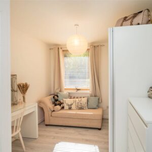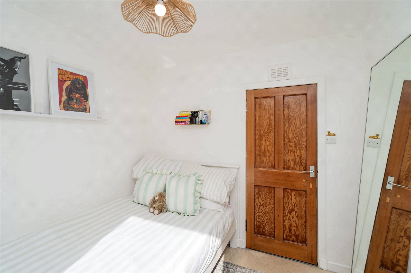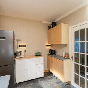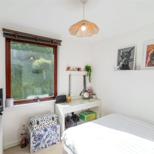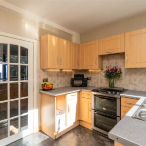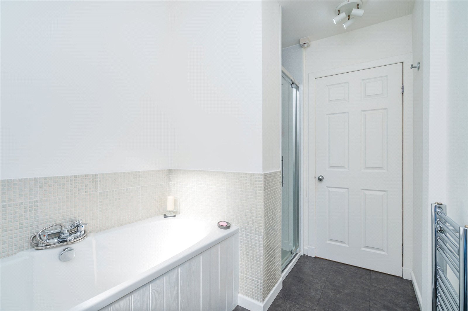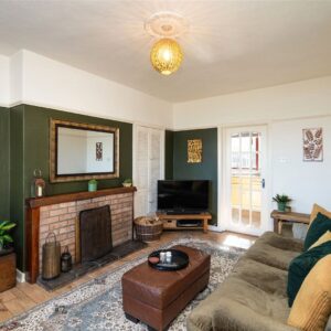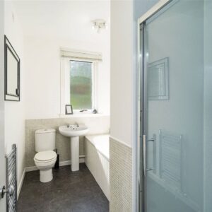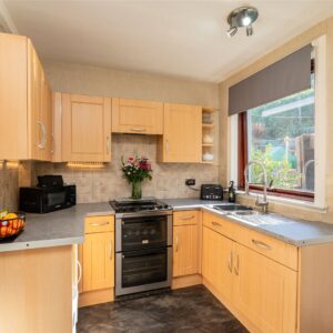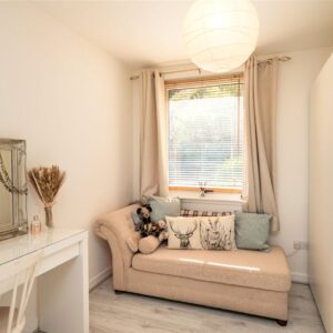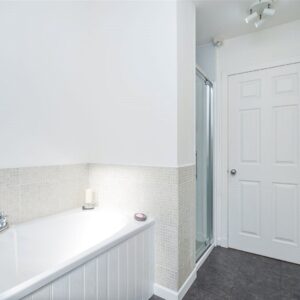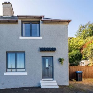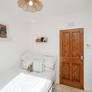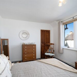 On the ground floor the home offers a welcoming sitting room complete with an open fire, creating a cosy focal point. The bright kitchen enjoys direct access to the garden, perfect for indoor-outdoor living. The family bathroom is situated to the rear, fitted with both a bathtub and separate shower. A useful under-stair storage cupboard completes the ground floor.