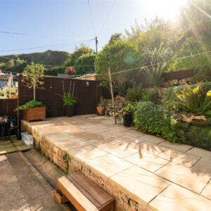 Outside, the terraced rear garden is designed for low-maintenance living, featuring a patio area at the bottom with mature plants and shrubs above. To the front, the property benefits from off-street parking.