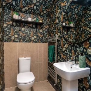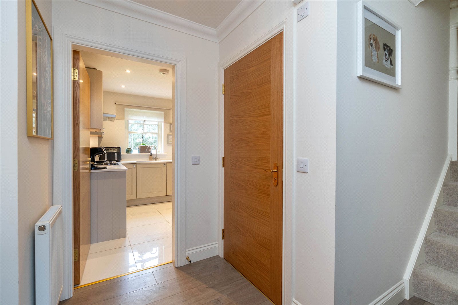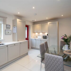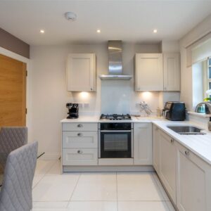 The ground floor comprises a welcoming entrance vestibule, a bright and comfortable sitting room, and a beautifully appointed dining kitchen featuring attractive shaker-style cabinetry, integrated appliances, and space for dining. A useful WC completes the ground floor accommodation.