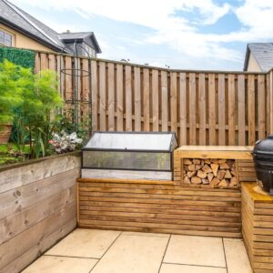 Externally, the property enjoys a beautifully landscaped garden. Stepping out from the kitchen, you're greeted by a neatly lawned garden, complete with a gravel path and a handy storage shed, perfect for keeping outdoor essentials organised. Steps lead down past flower beds to a sheltered patio area, which includes a stylish outdoor kitchen and plenty of space for a large dining table, ideal for alfresco dining and entertaining.