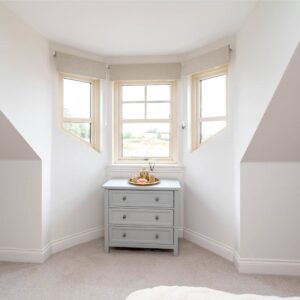 The second floor is dedicated to the principal bedroom, a spacious and elegant room with a charming bay window, a large built-in cupboard providing excellent storage and a sleek en-suite shower room.