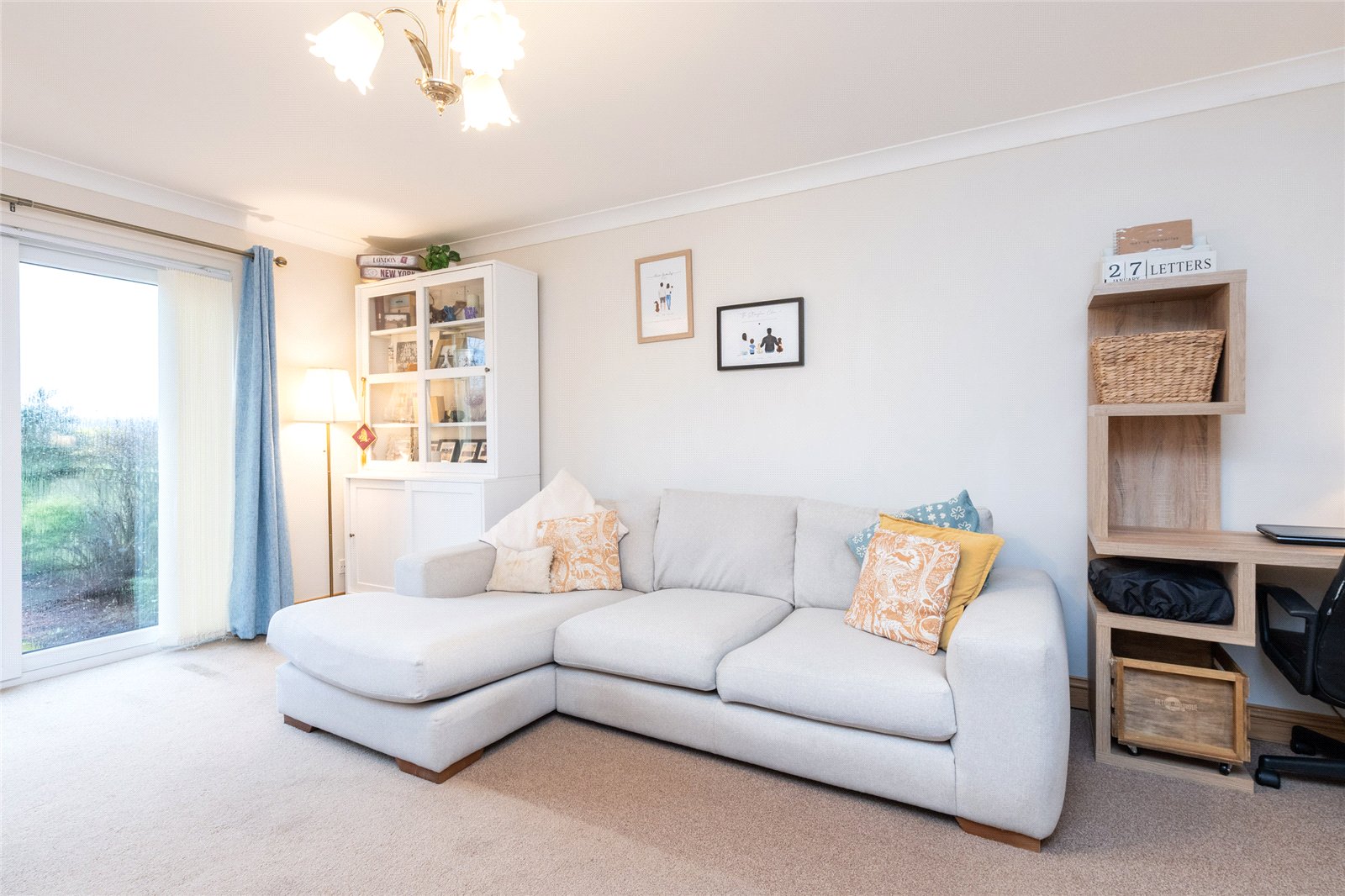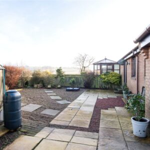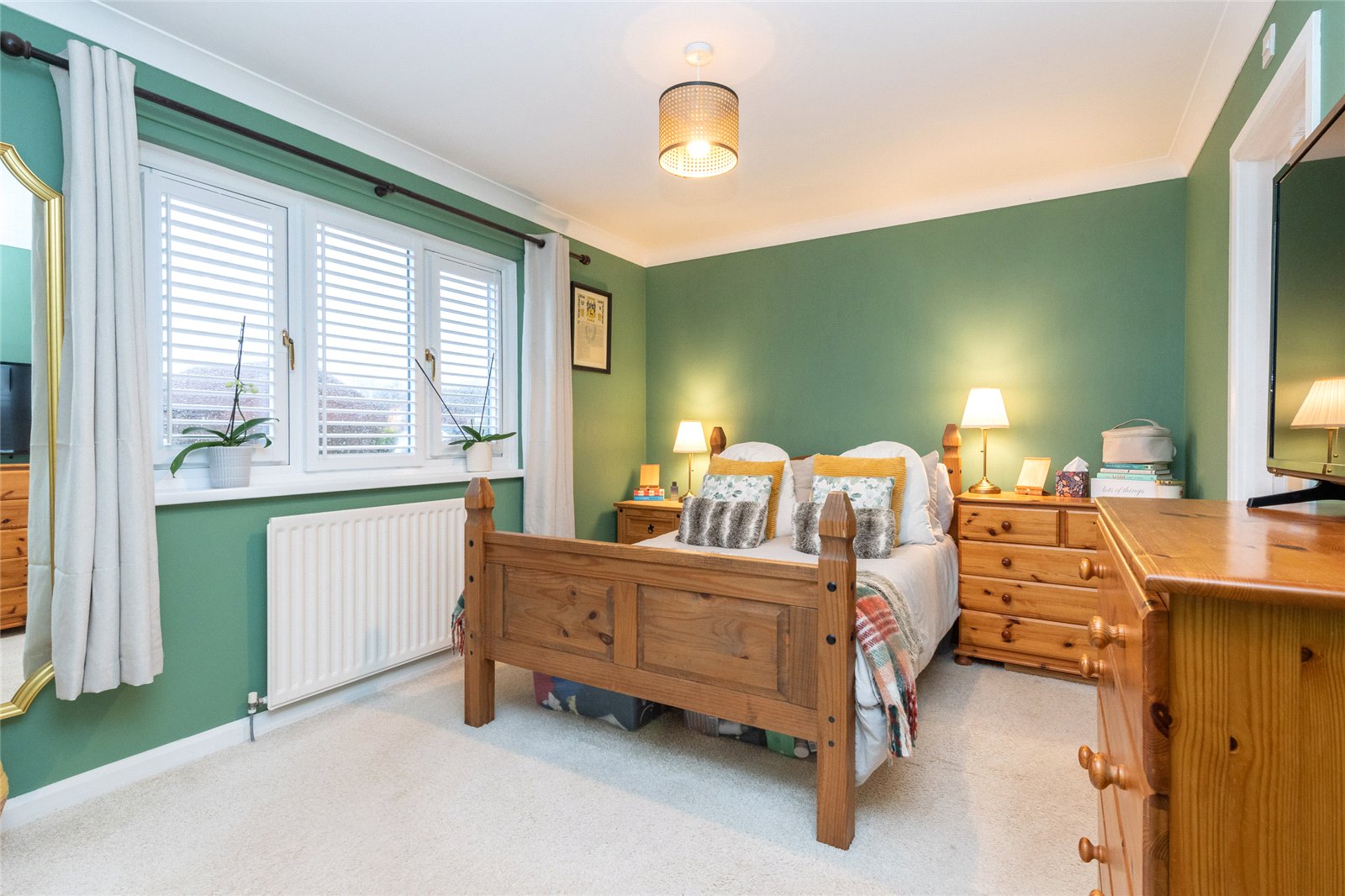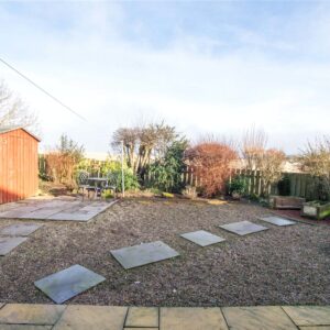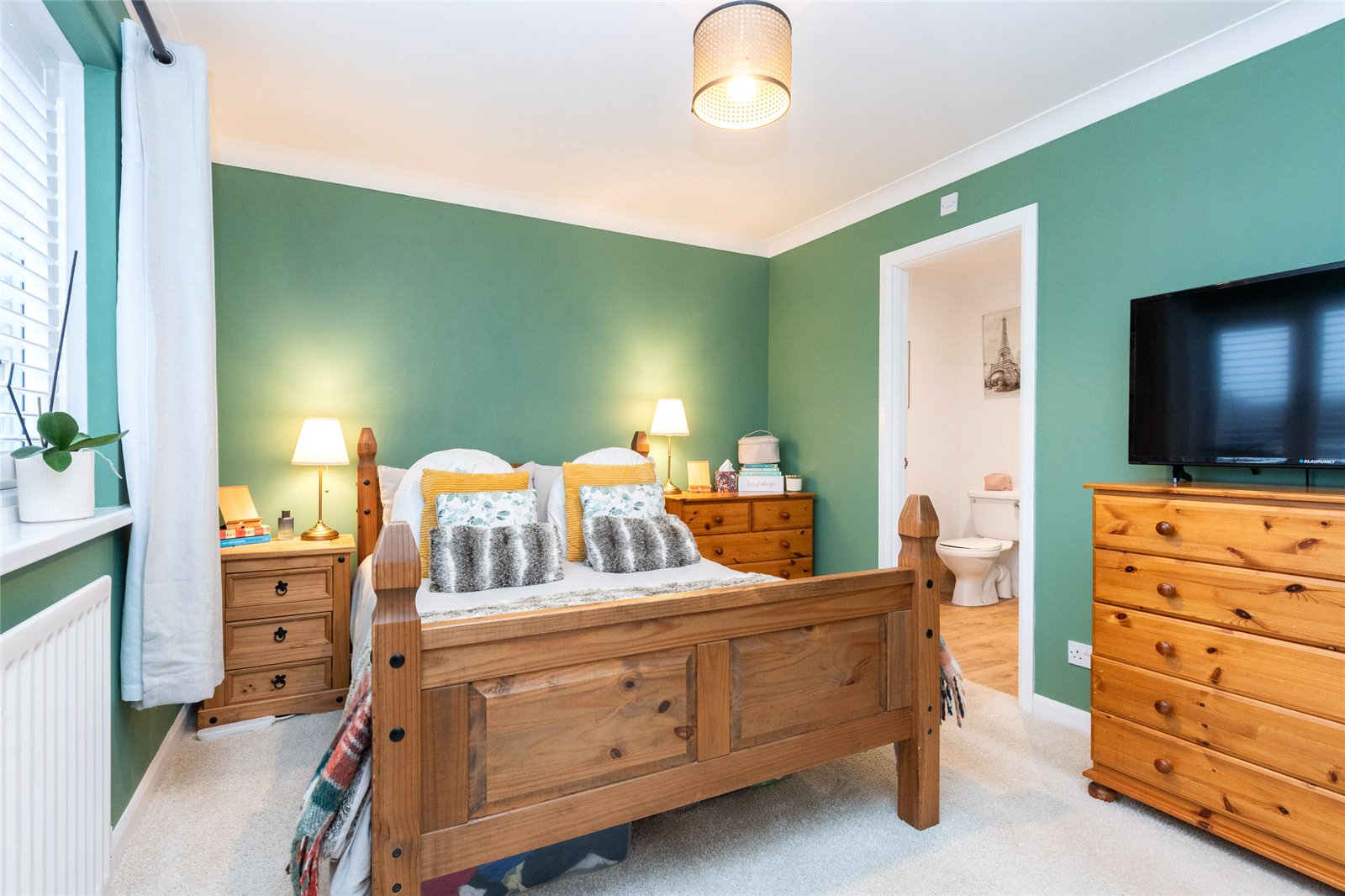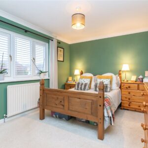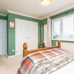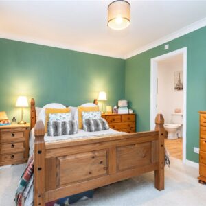 To the left of the front door lies the principal bedroom, which benefits from a built-in wardrobe and a well-appointed en-suite shower room. Two further bedrooms complete the accommodation, including a generous double bedroom with built-in storage and a single bedroom overlooking the rear garden, ideal as a guest room, home office or hobby space. A well-appointed family bathroom serves the remaining bedrooms and completes the internal accommodation.