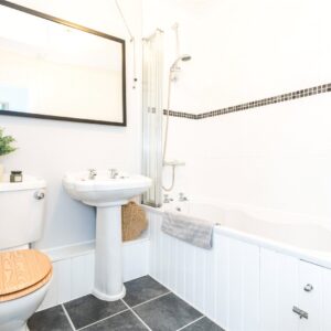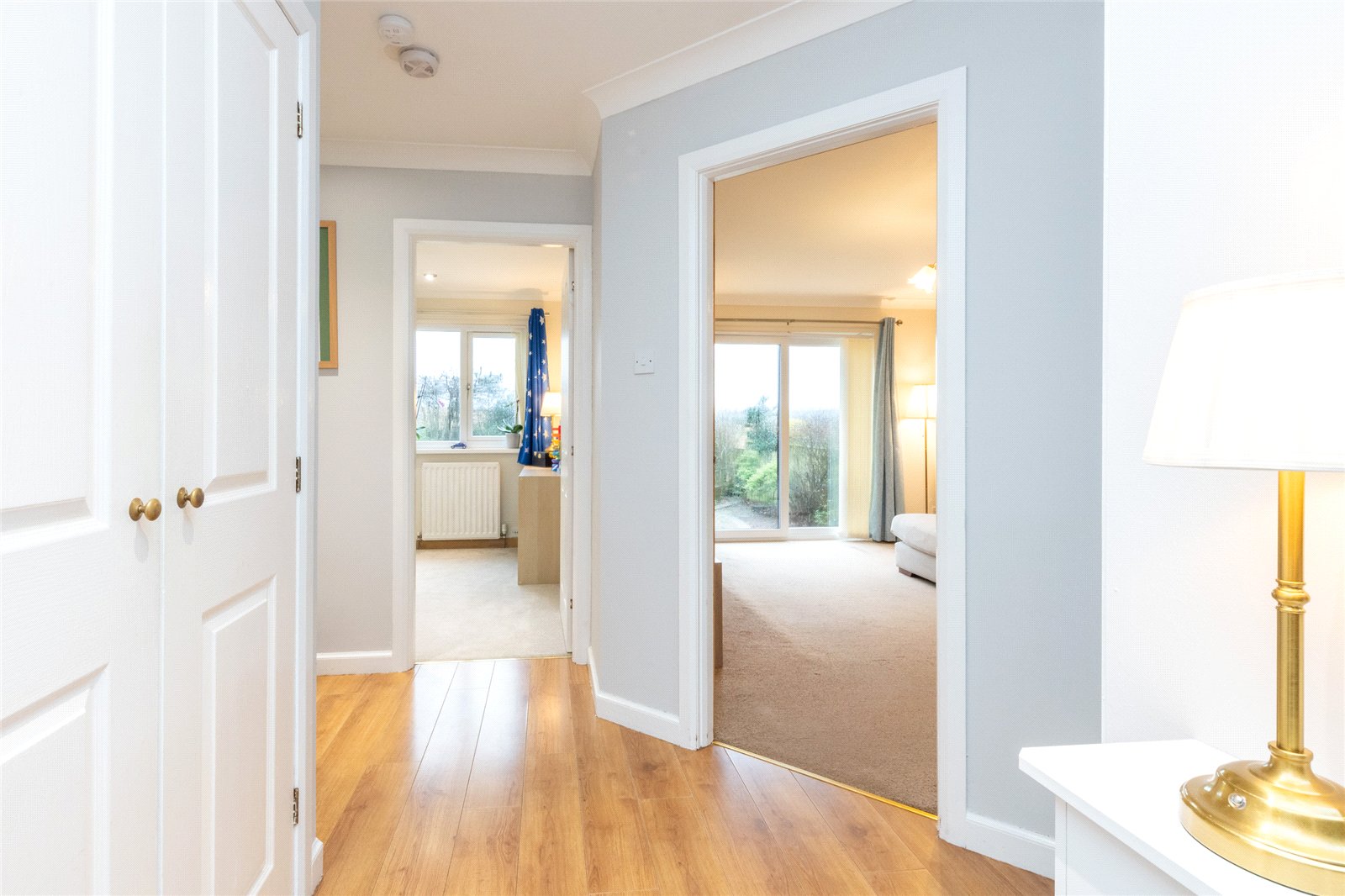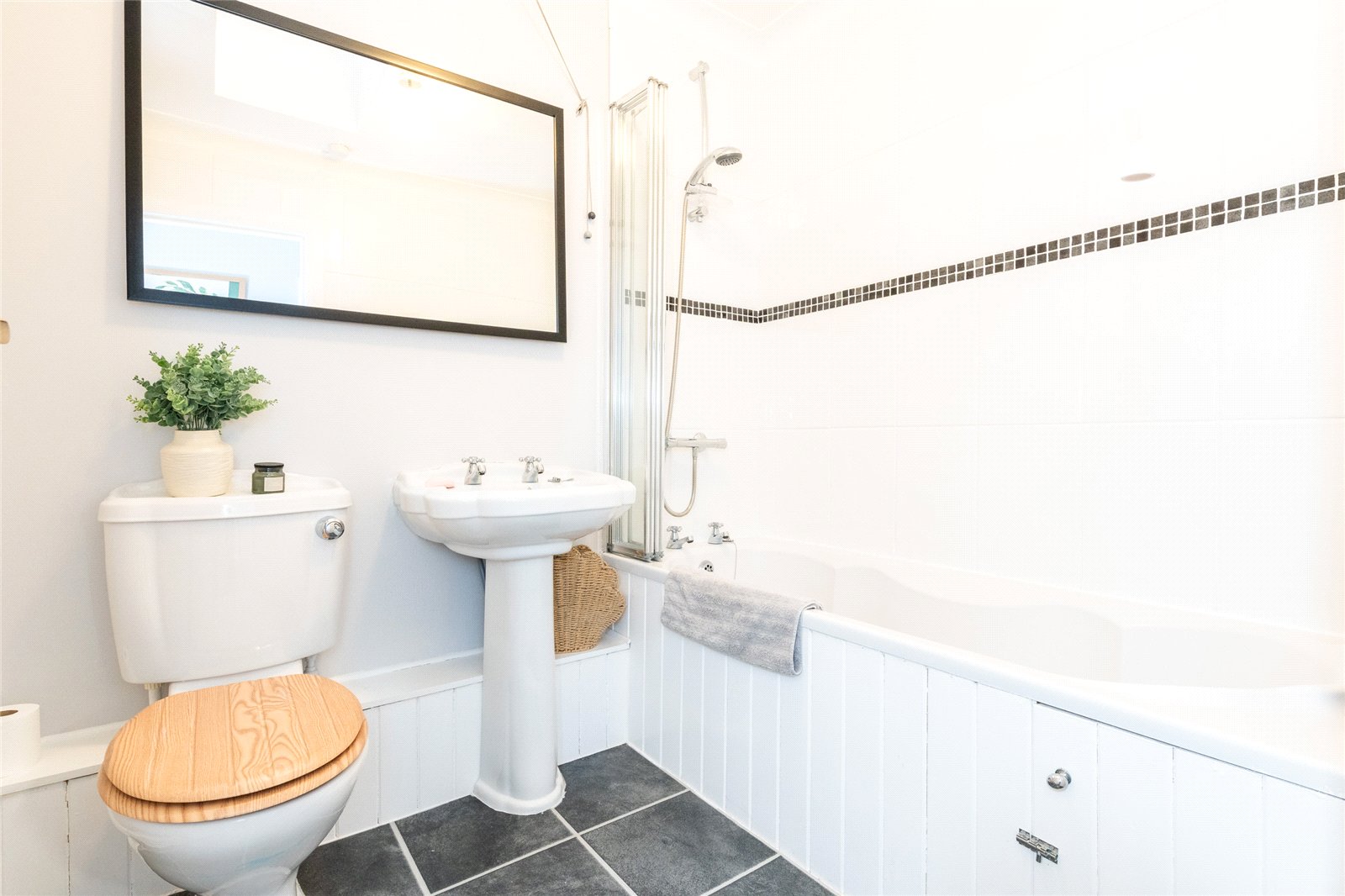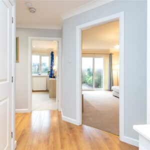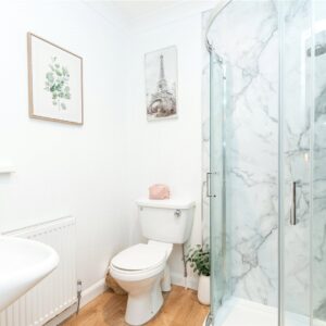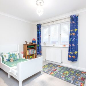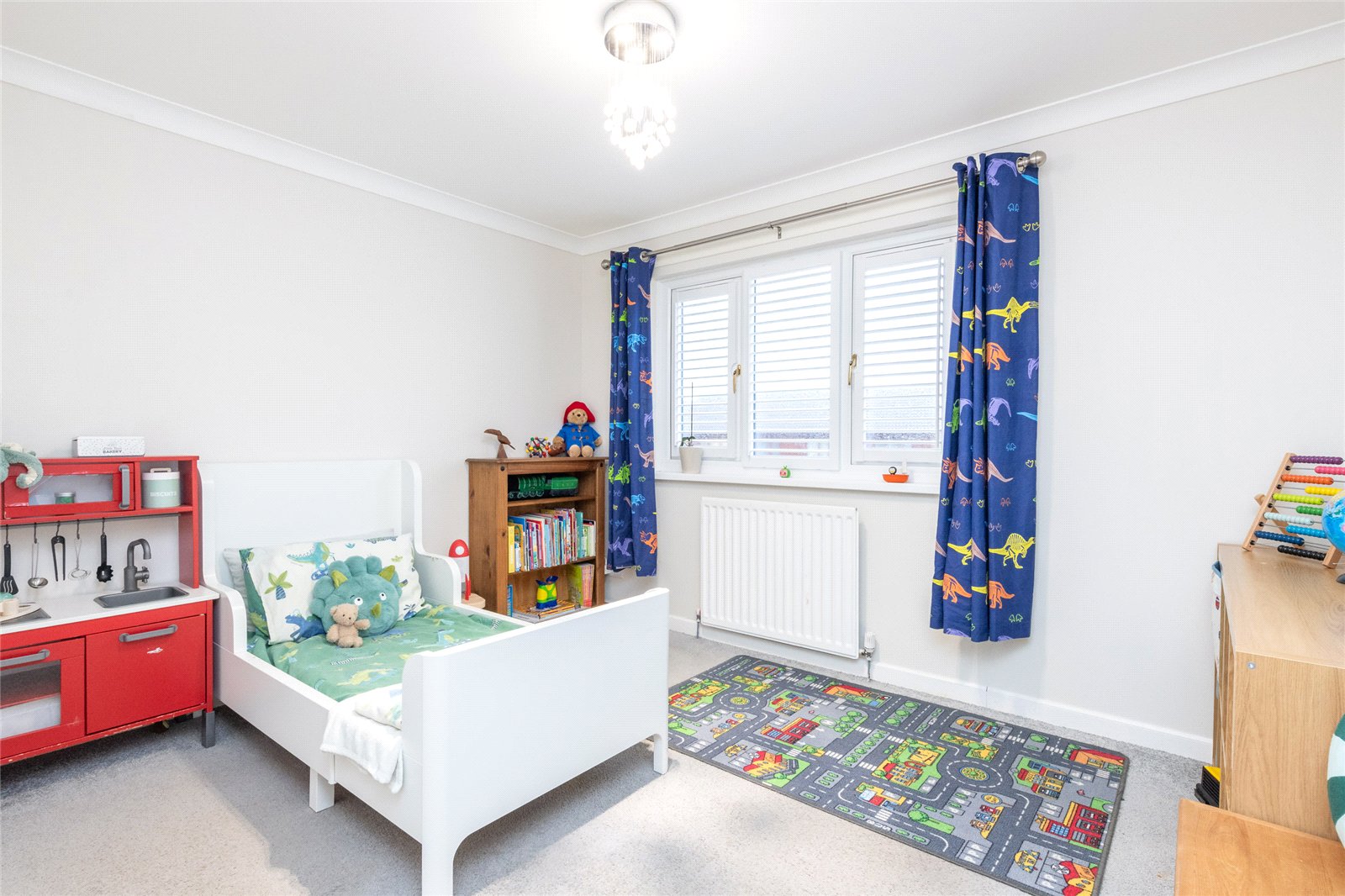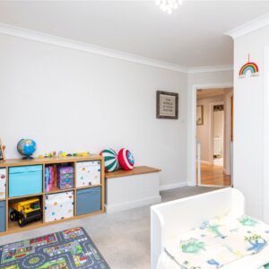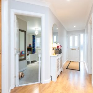 To the left of the front door lies the principal bedroom, which benefits from a built-in wardrobe and a well-appointed en-suite shower room. Two further bedrooms complete the accommodation, including a generous double bedroom with built-in storage and a single bedroom overlooking the rear garden, ideal as a guest room, home office or hobby space. A well-appointed family bathroom serves the remaining bedrooms and completes the internal accommodation.