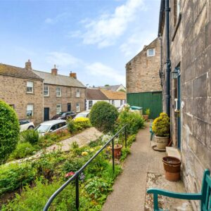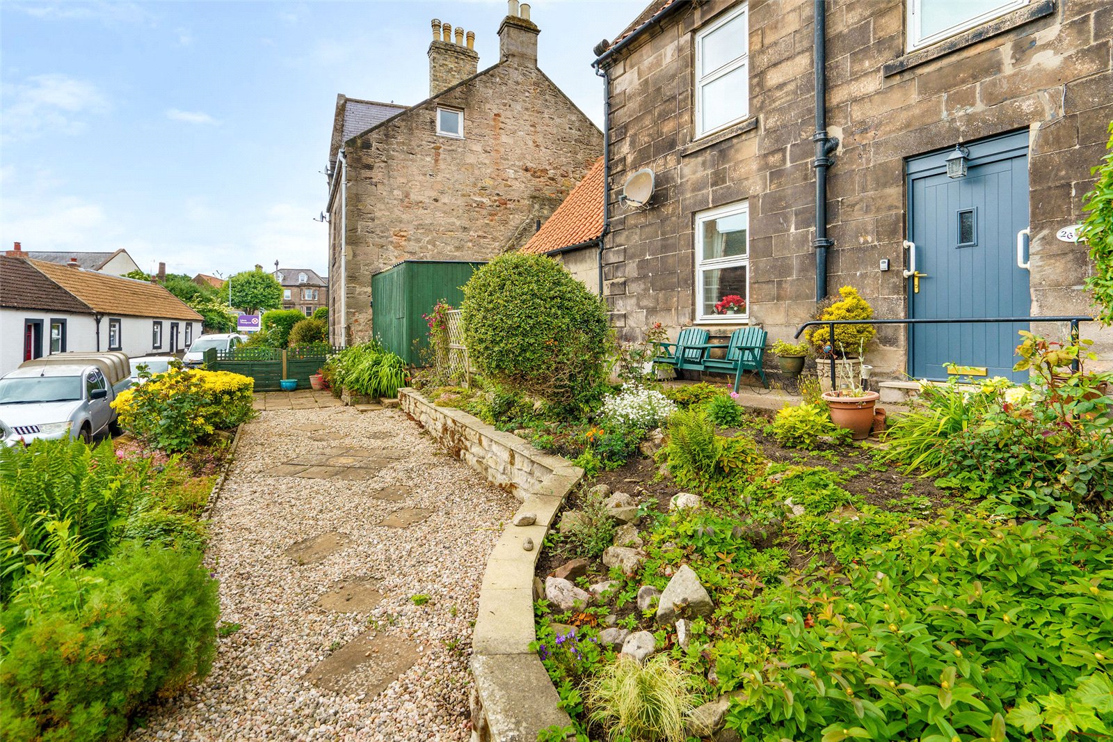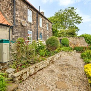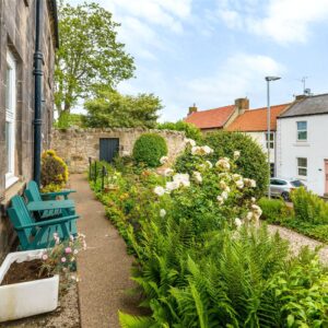 Outside, the home is complemented by a charming landscaped front garden, featuring mature herbaceous borders, paved seating areas, and mature shrubs. There is a useful enclosed storage shed to the side and a small courtyard for further outdoor use.