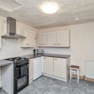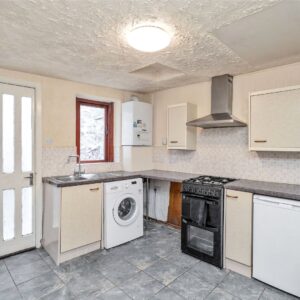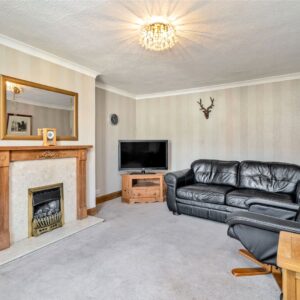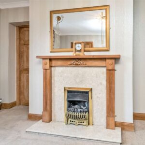 Adjacent is the sitting room, a bright and comfortable reception room with a carved fireplace with a marble inset hearth and gas fire. An internal hallway leads to the kitchen and bathroom. The kitchen is well-equipped with a range of fitted units, granite-effect worktops and a tiled splashback. A side entrance door provides external access.