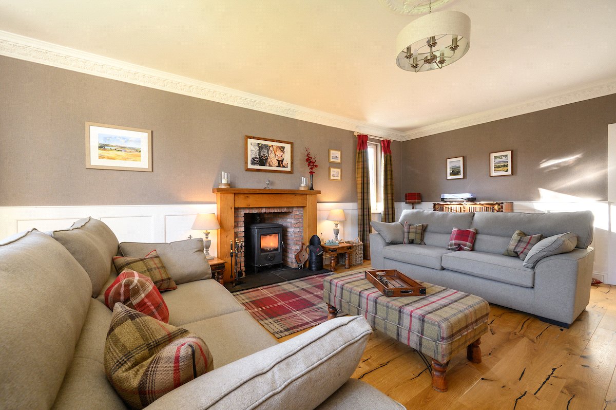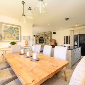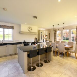 Upon entering Eden Brook Farm, you are welcomed into a beautiful entrance hall, featuring a grand imperial staircase that sets the tone for the elegance and space found throughout the home.At the heart of the ground floor lies a stunning open-plan dining kitchen and living area. This contemporary space is thoughtfully designed with a central island, bespoke media unit, and patio doors that open seamlessly to the garden, perfect for both everyday living and entertaining. The inviting drawing room features a charming multi-fuel stove, creating a warm and welcoming atmosphere.