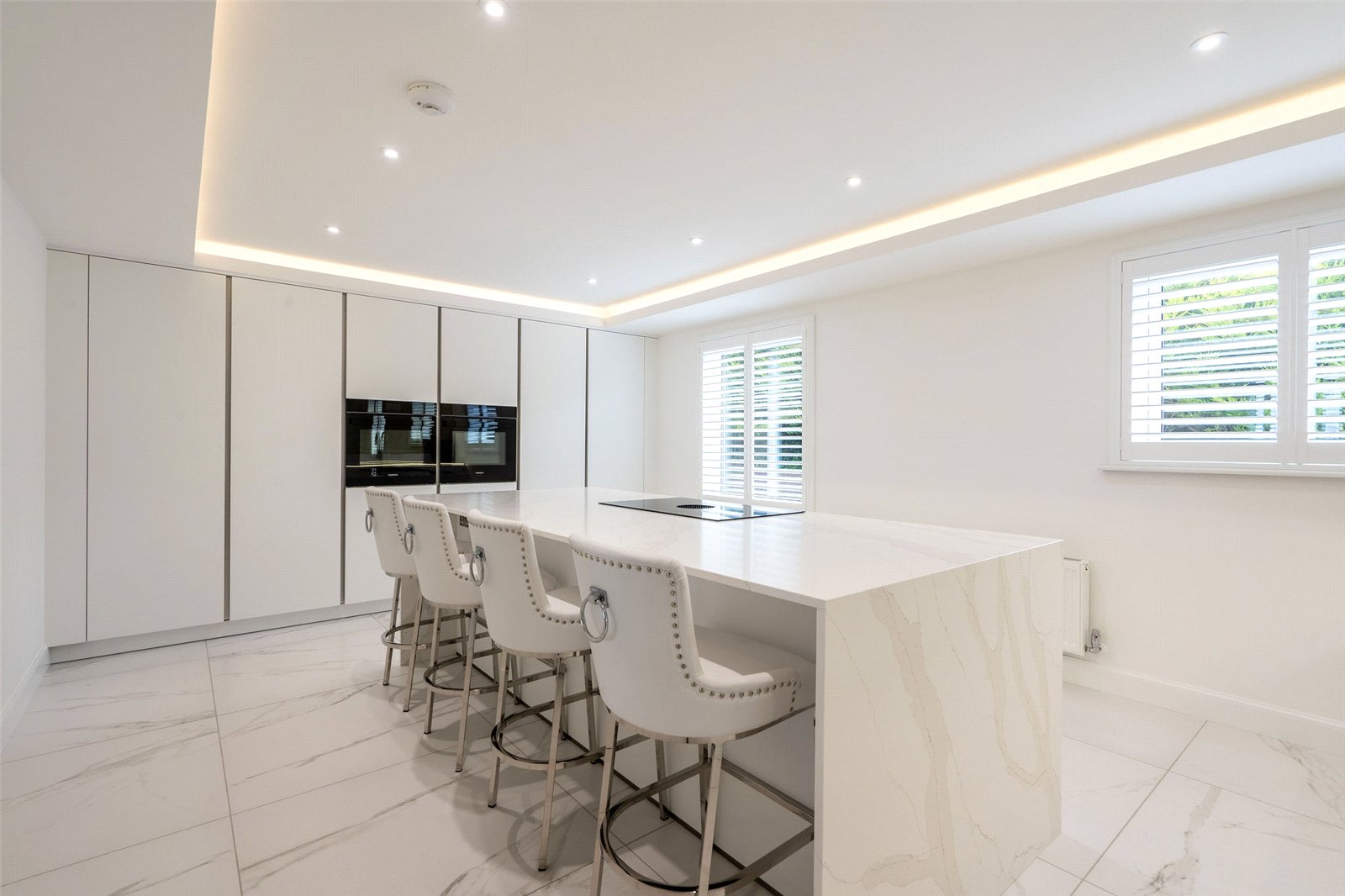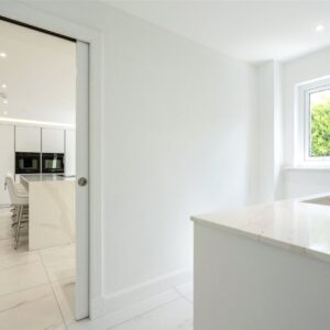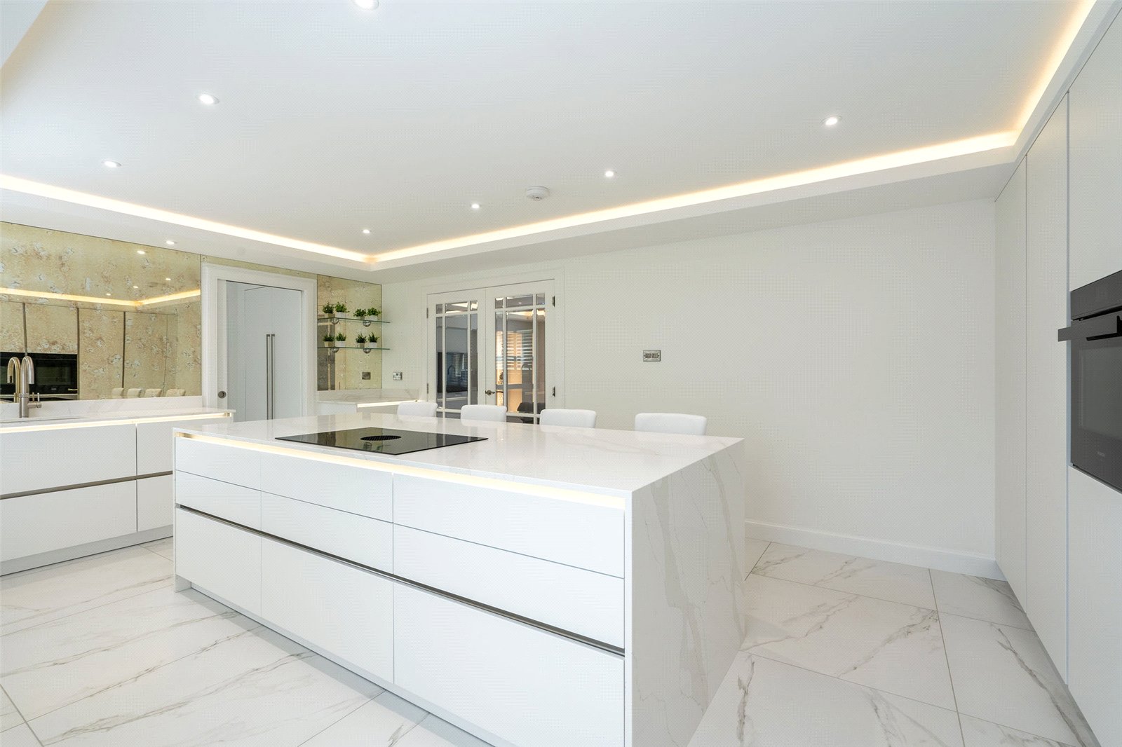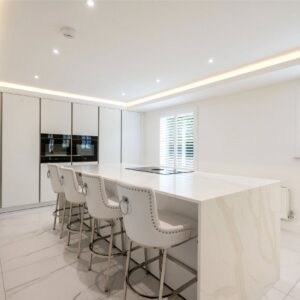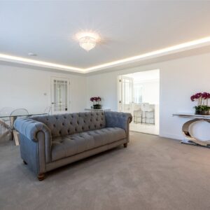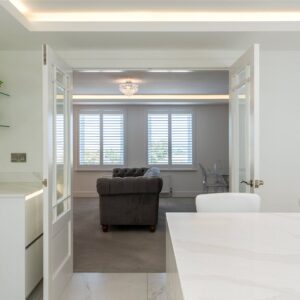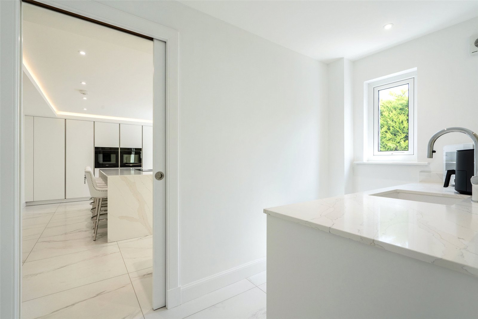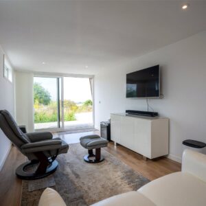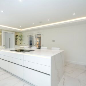 A welcoming vestibule opens into a central hallway with excellent storage. The bright and spacious sitting room lies to the front, enjoying open views and fitted entertainment shelving. The impressive kitchen/family room is a standout feature, finished in a sleek, contemporary style with an island featuring waterfall edging and top-quality integrated appliances, including a Bora induction hob with built-in extractor, two Siemens ovens, fridge, freezer, and a Quooker boiling water tap.