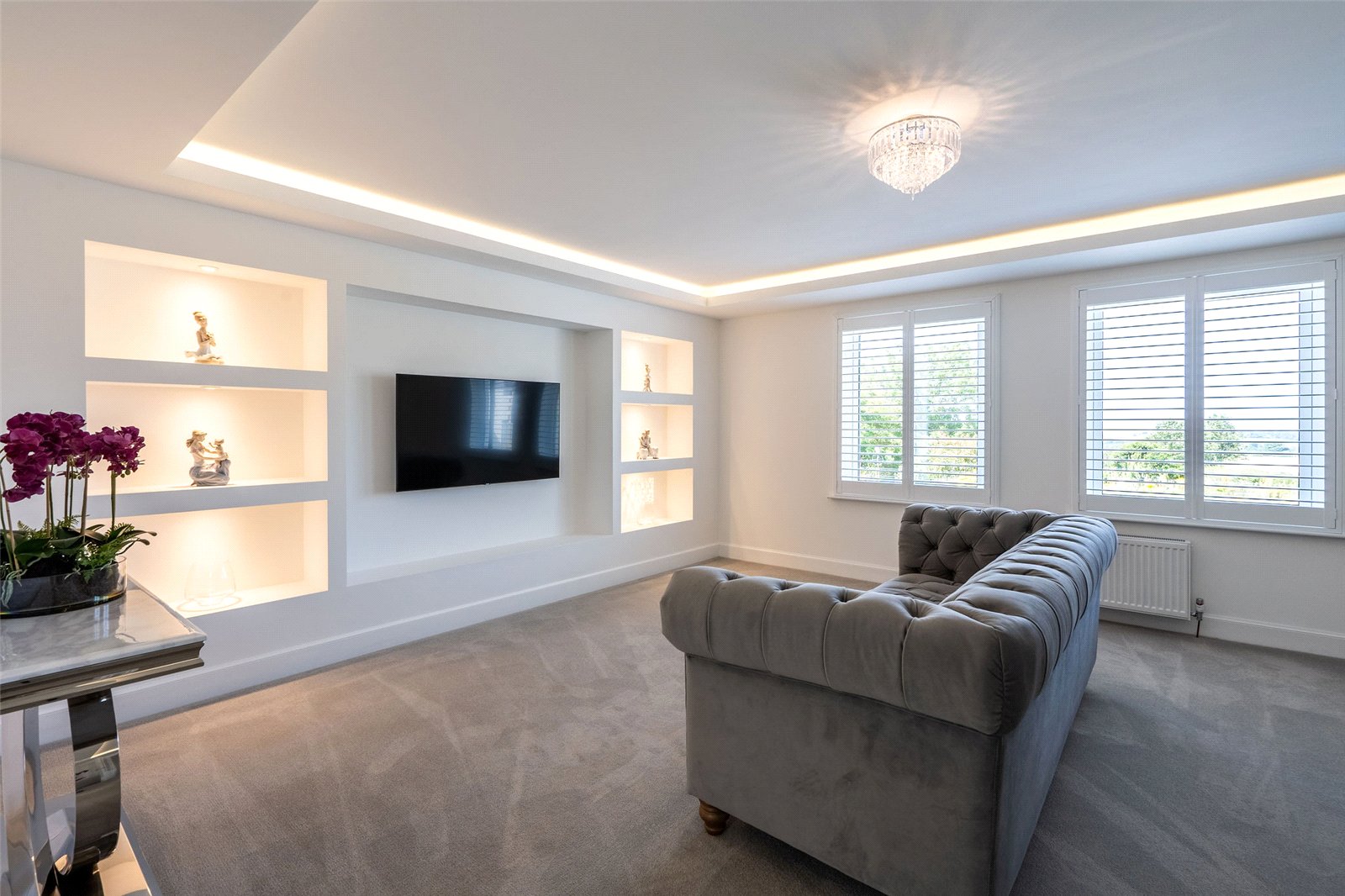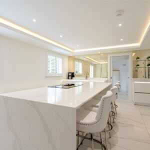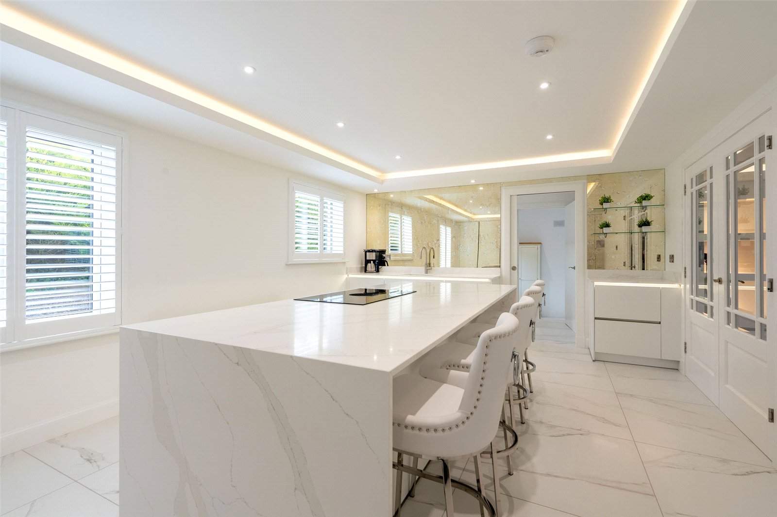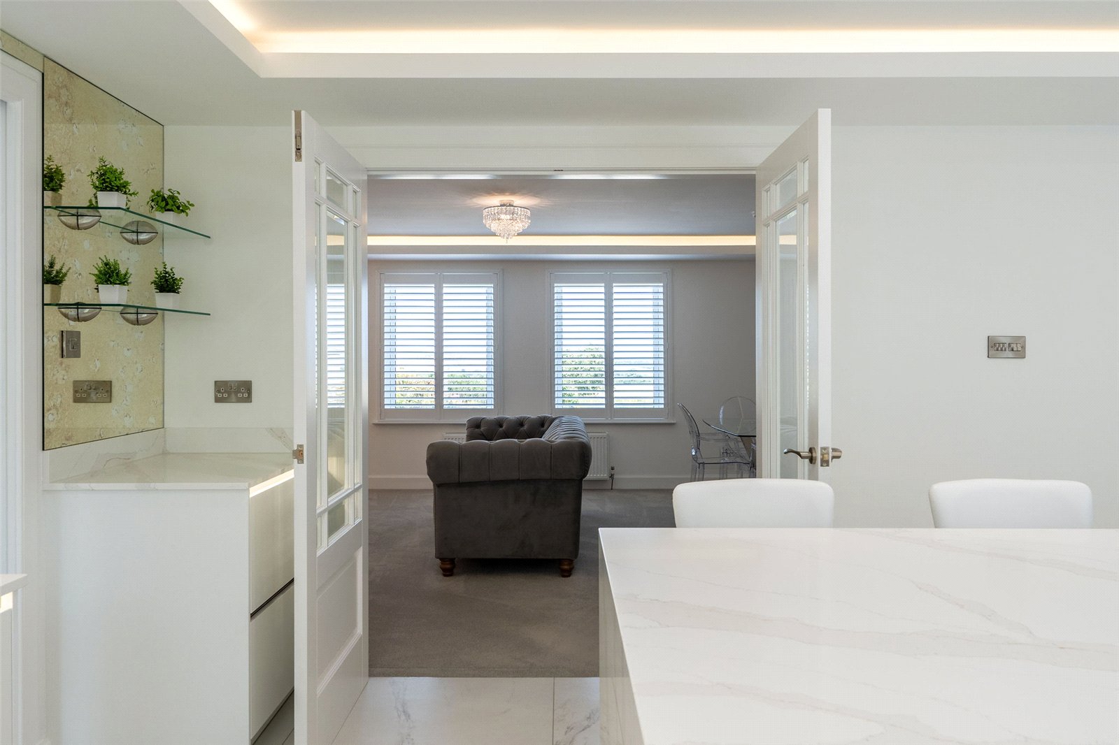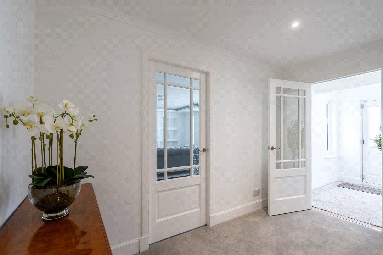 A welcoming vestibule opens into a central hallway with excellent storage. The bright and spacious sitting room lies to the front, enjoying open views and fitted entertainment shelving. The impressive kitchen/family room is a standout feature, finished in a sleek, contemporary style with an island featuring waterfall edging and top-quality integrated appliances, including a Bora induction hob with built-in extractor, two Siemens ovens, fridge, freezer, and a Quooker boiling water tap.