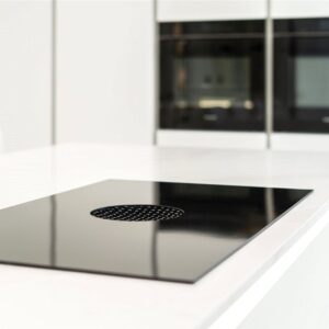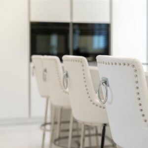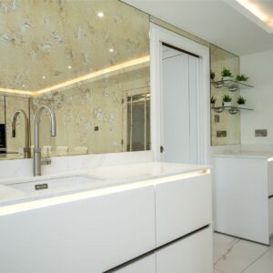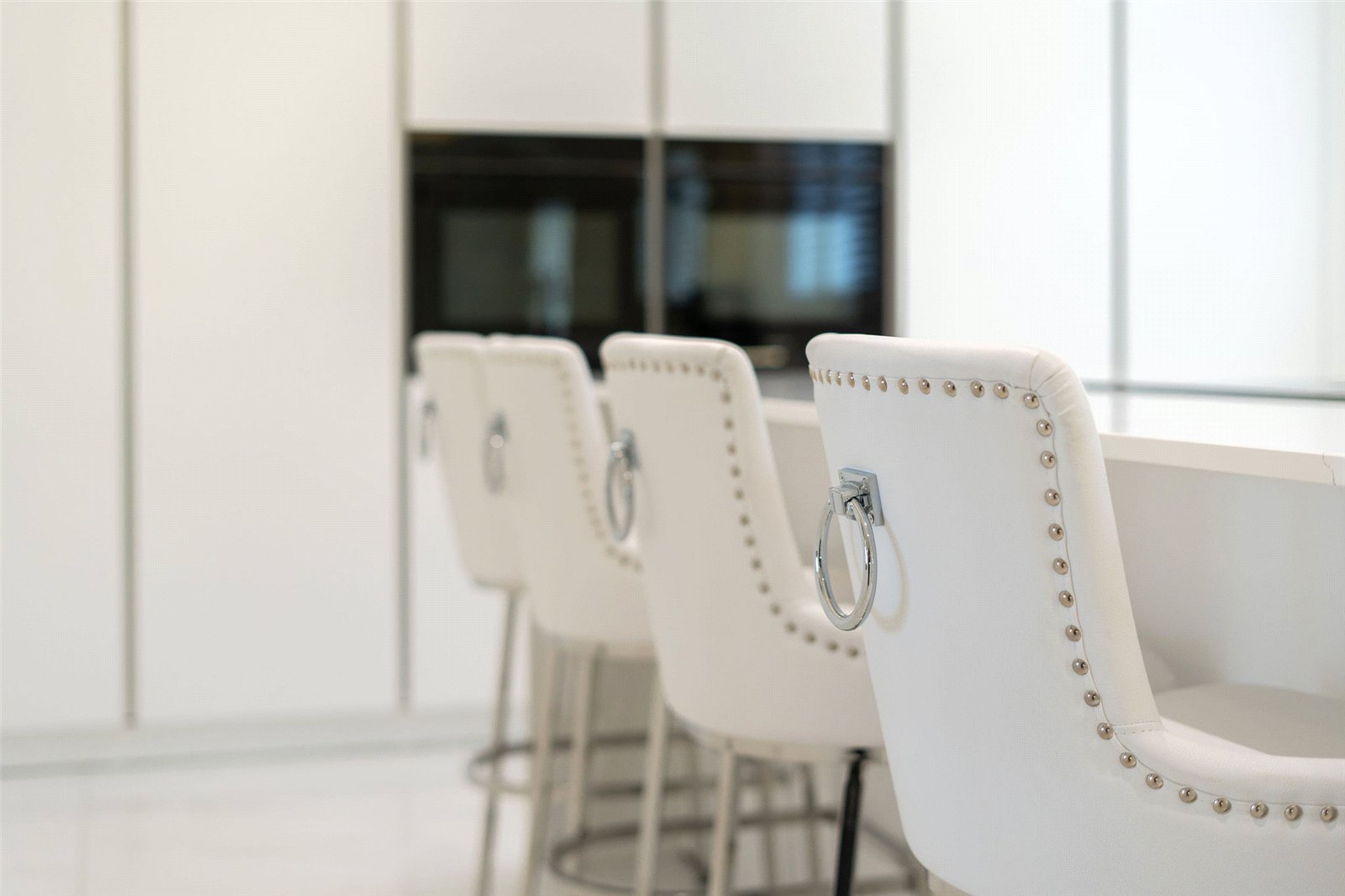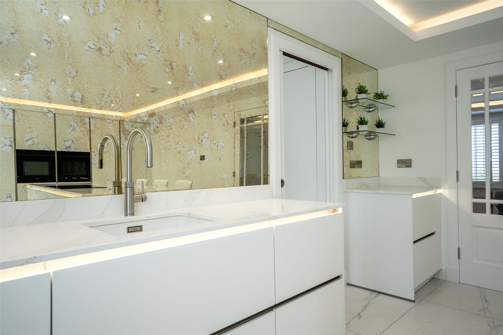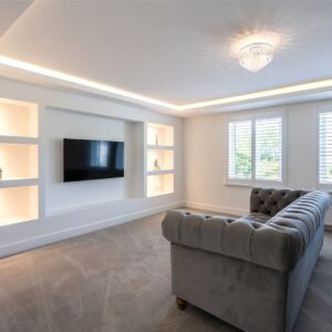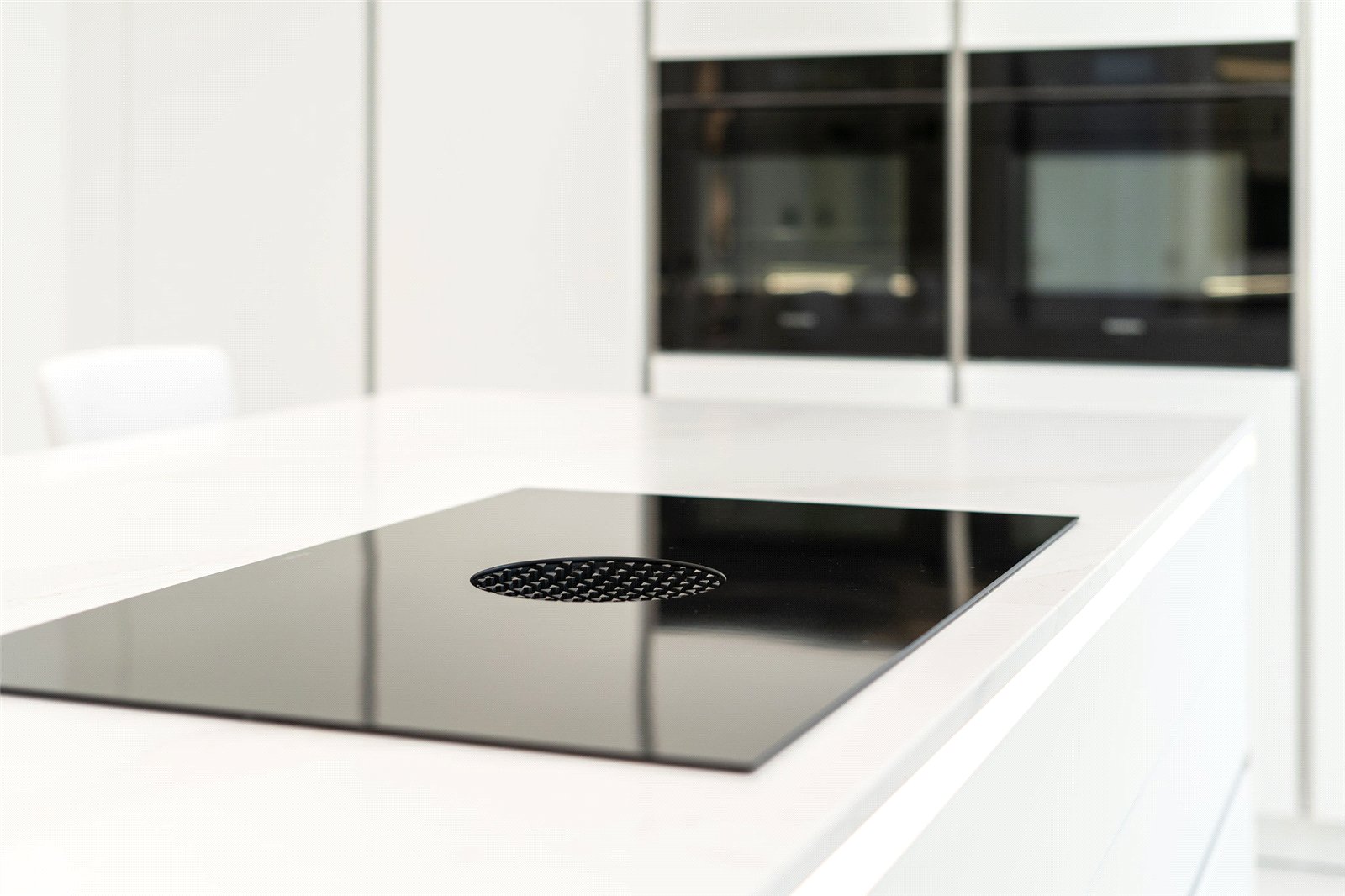 A welcoming vestibule opens into a central hallway with excellent storage. The bright and spacious sitting room lies to the front, enjoying open views and fitted entertainment shelving. The impressive kitchen/family room is a standout feature, finished in a sleek, contemporary style with an island featuring waterfall edging and top-quality integrated appliances, including a Bora induction hob with built-in extractor, two Siemens ovens, fridge, freezer, and a Quooker boiling water tap.