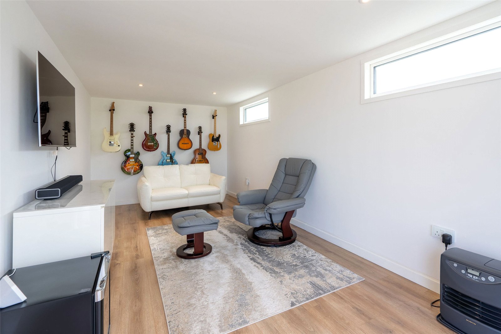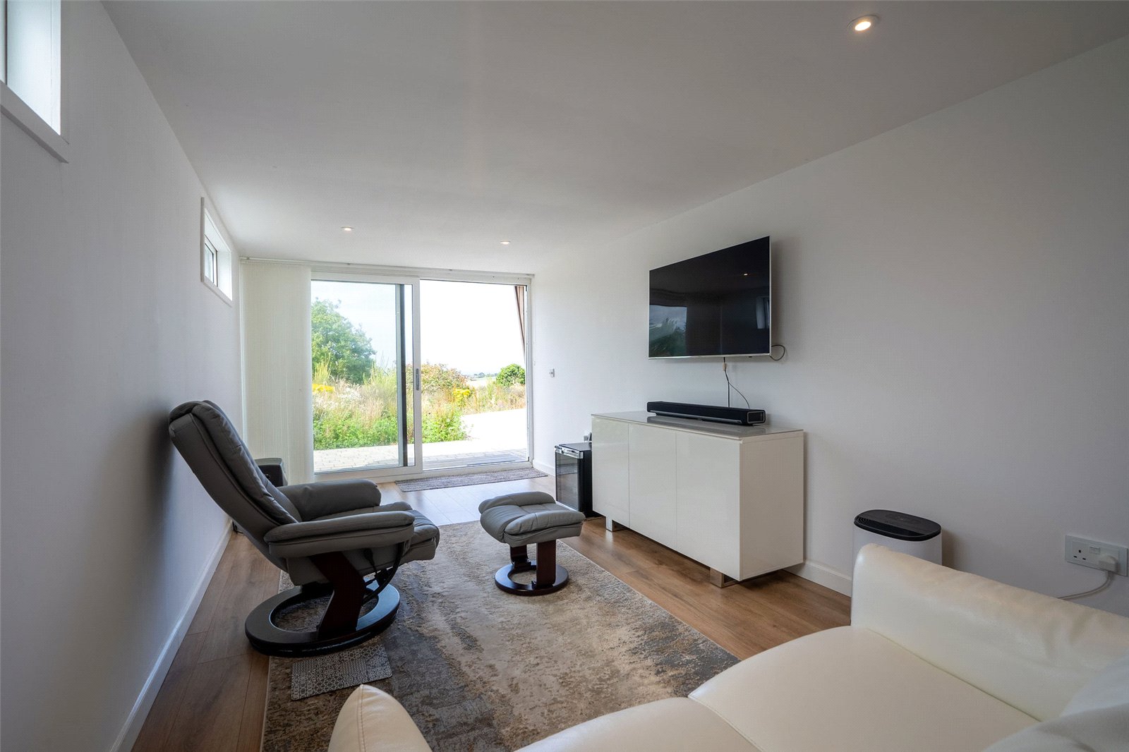 A real bonus is the fully insulated garden/music room, recently constructed beside the garage, featuring sliding glass doors and peaceful views across the front garden and towards the sea—perfect as a creative space, studio, or home office.