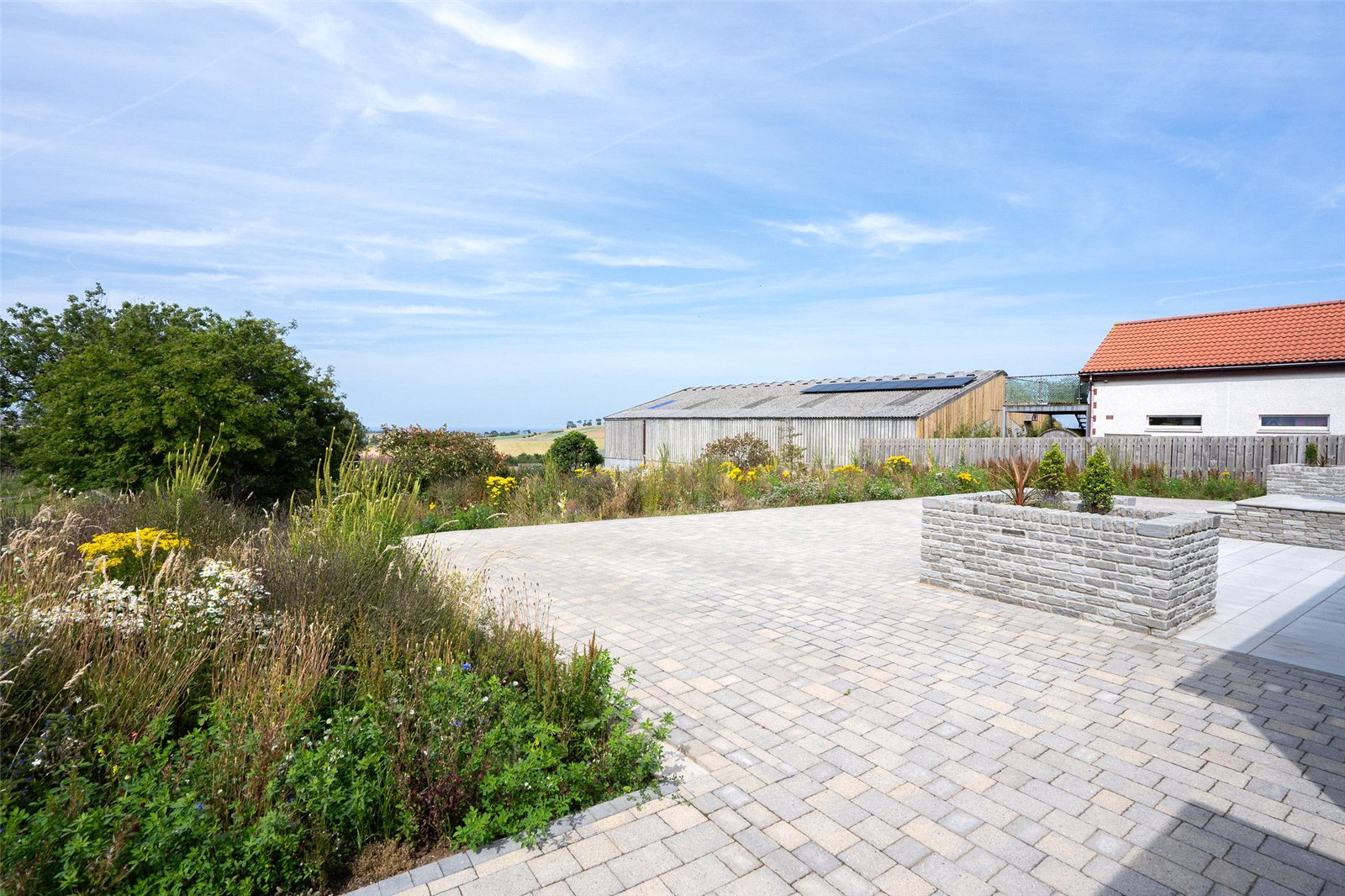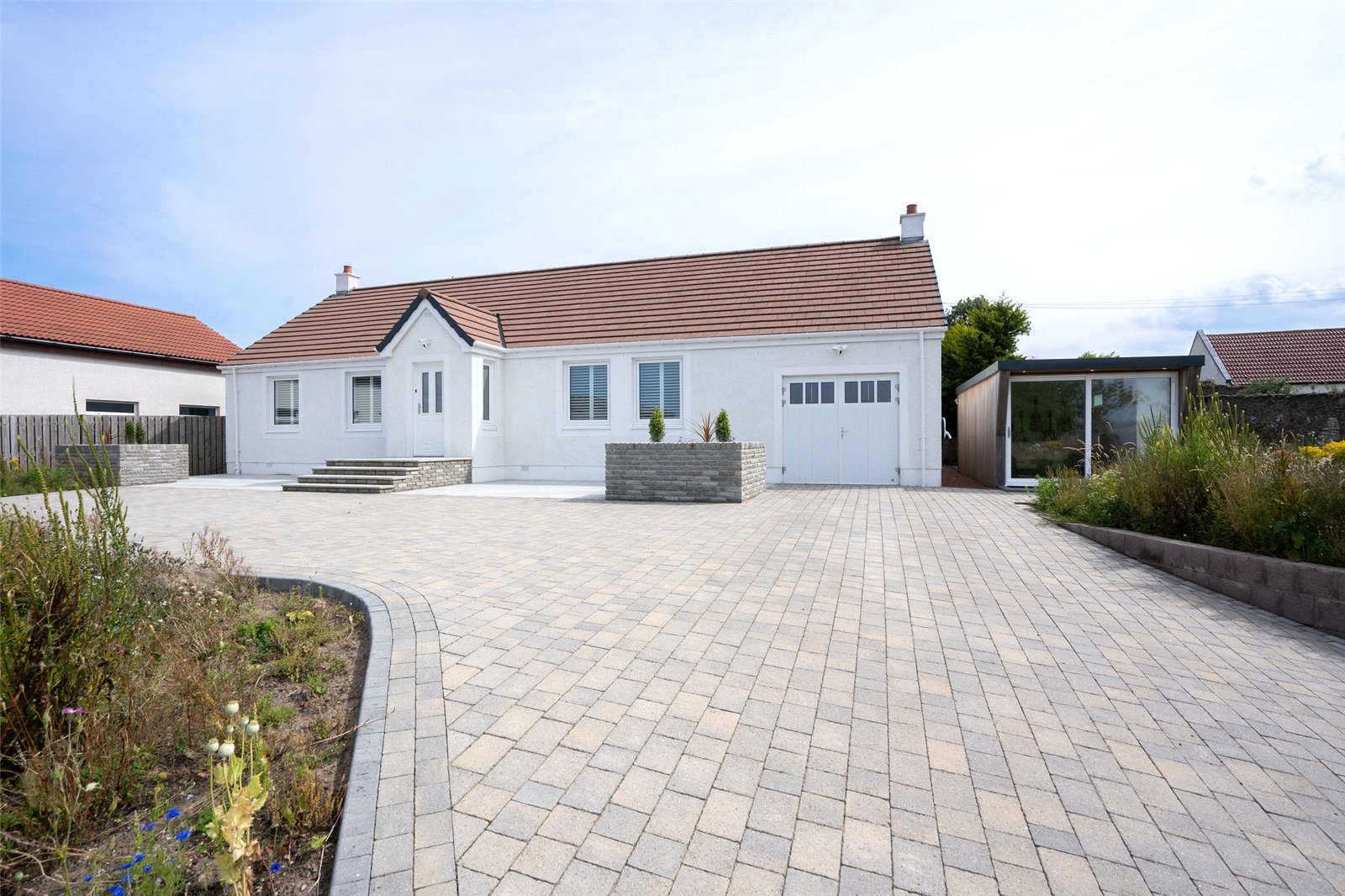 Externally, a large monoblock driveway provides parking for multiple vehicles. The front garden has been attractively planted with wildflowers, and to the rear you'll find a gravelled seating area, flower beds, and a summer house, ideal for relaxing outdoors.