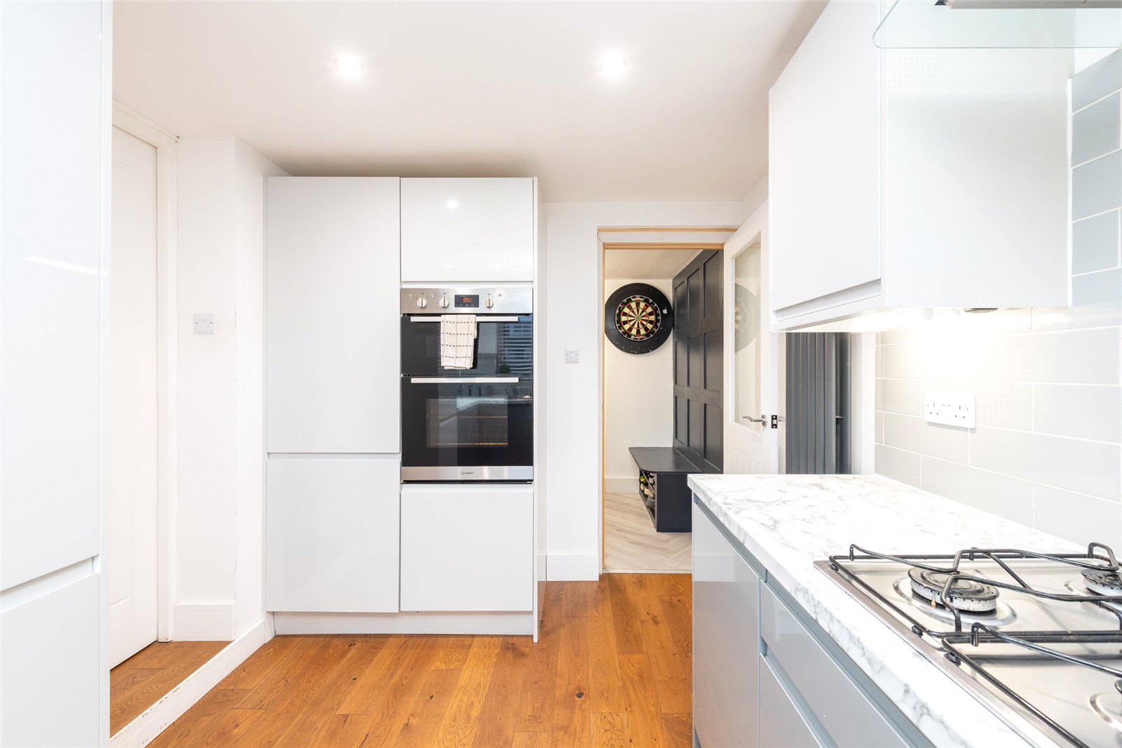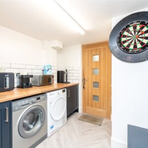 To the right of the entrance, the property opens into a hallway space which the current owners utilise as a dining area, providing a sociable setting for everyday meals. From here, a door leads through to the modern kitchen, offering a functional and contemporary space for cooking. Beyond the kitchen sits a useful utility room, with a further door providing direct internal access to the garage.