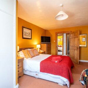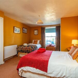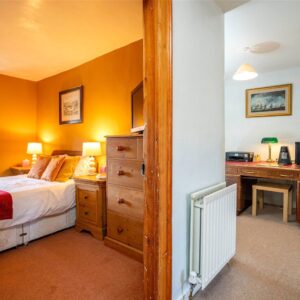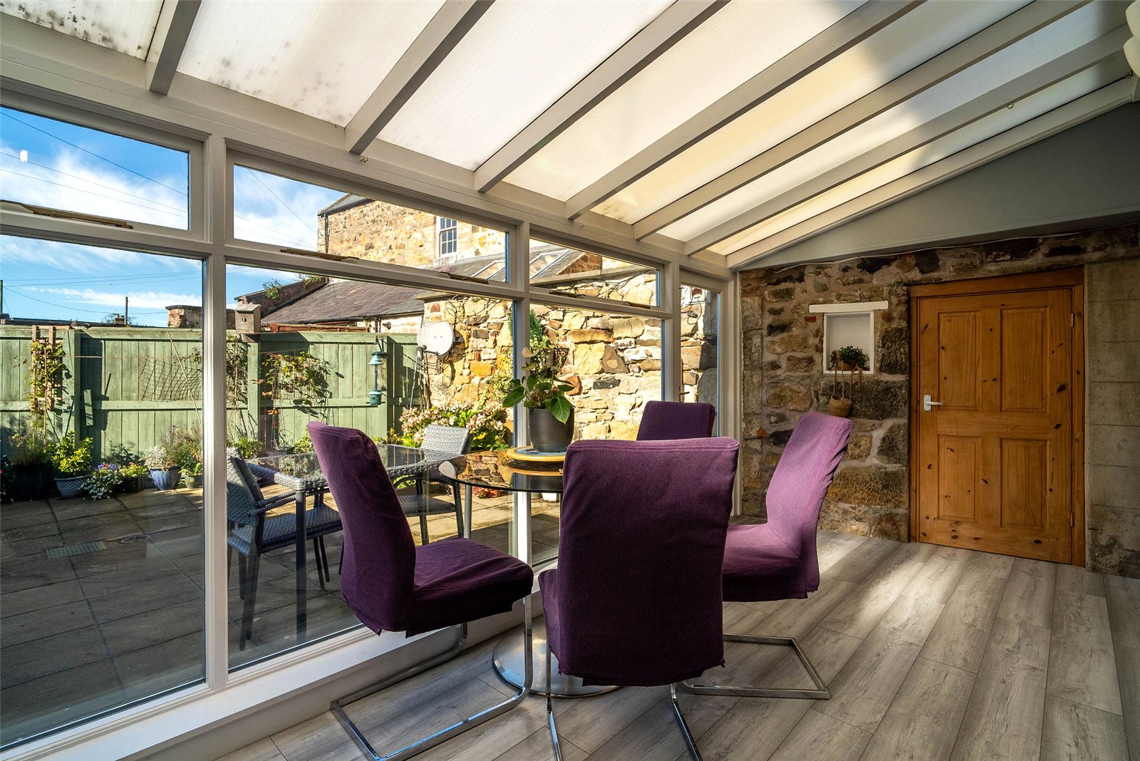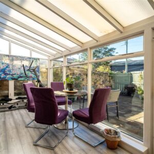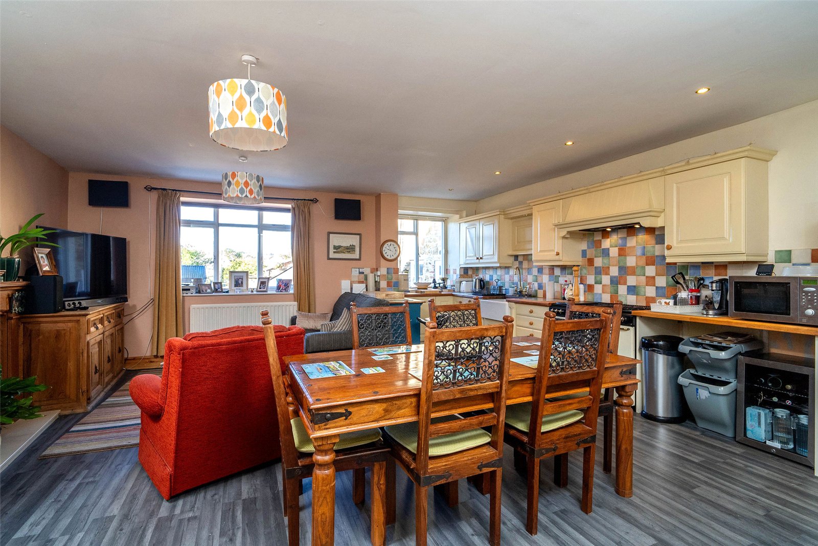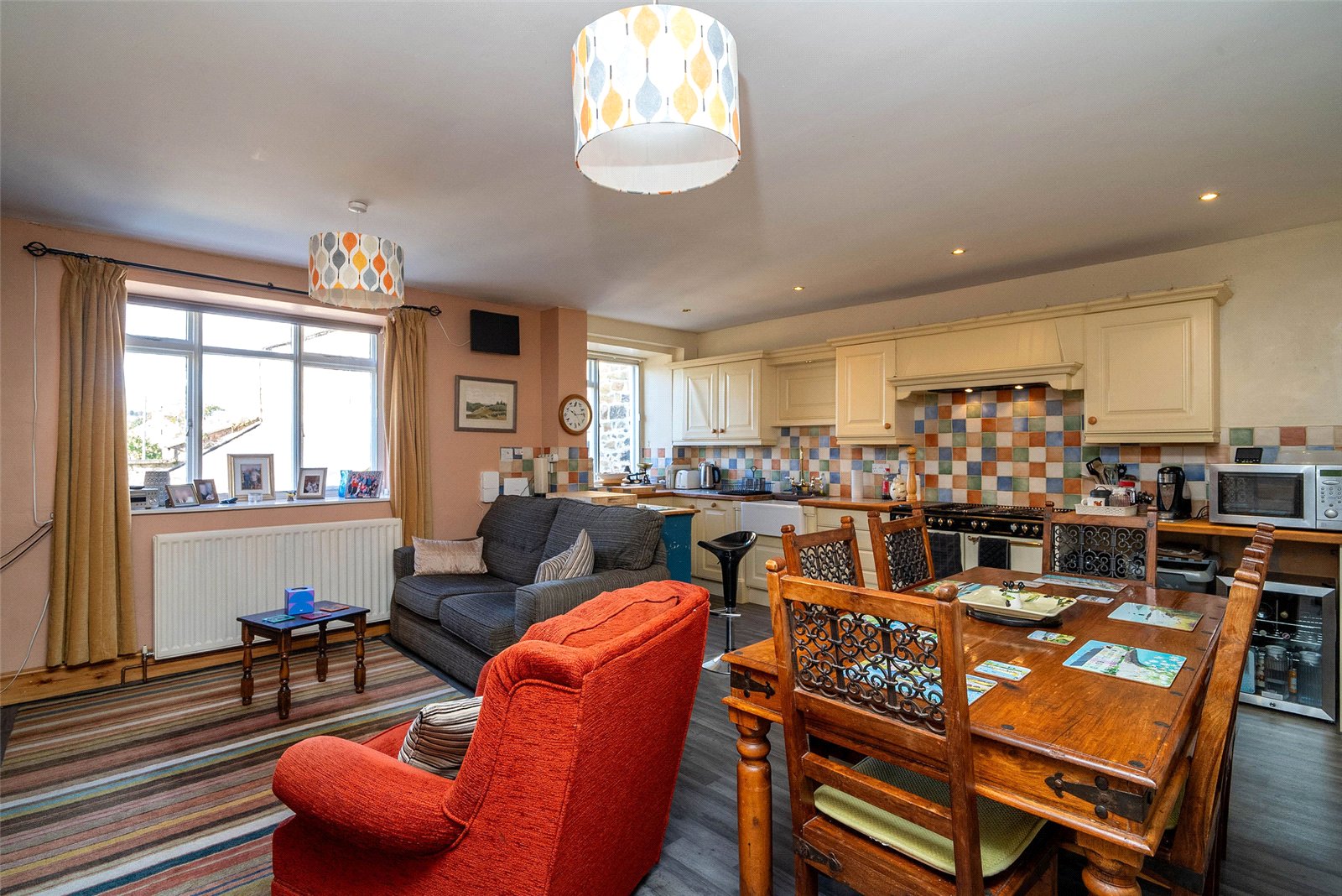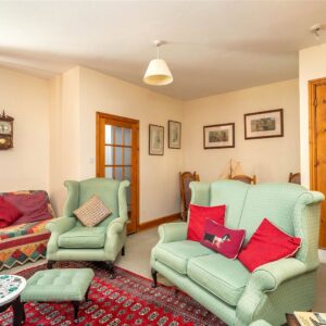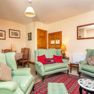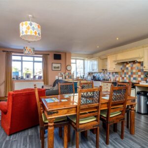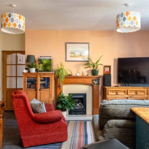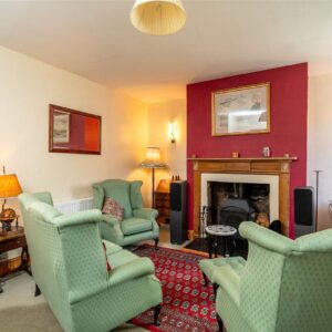 The welcoming entrance vestibule opens into a sitting room, where a wood-burning stove sits within a striking stone fireplace, perfect for cosy evenings. To the rear, a large dining kitchen features a Belfast sink, range cooker, integrated dishwasher, and ample space for a dining table and relaxed seating area.