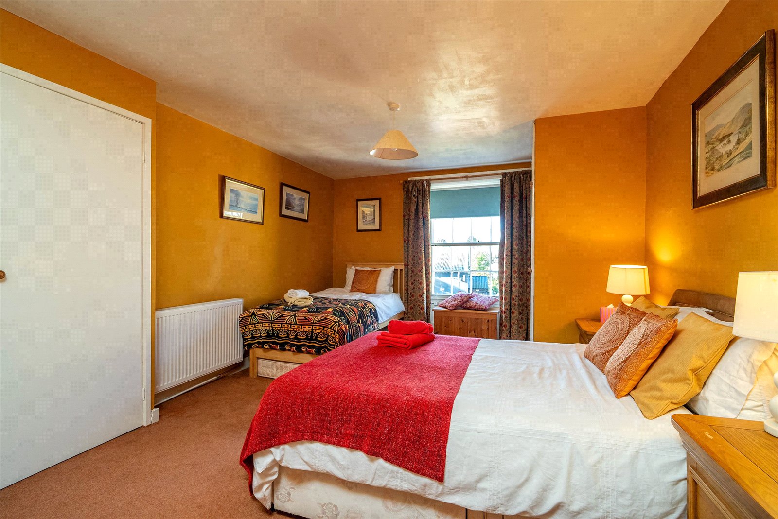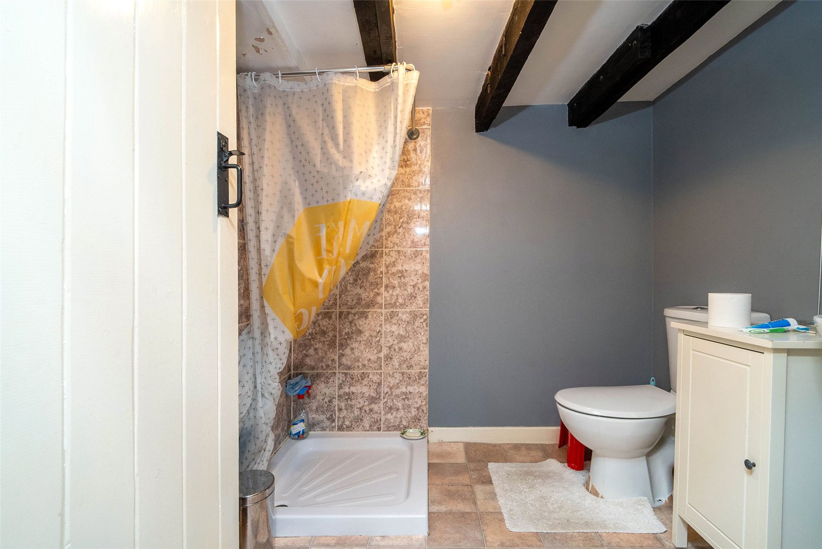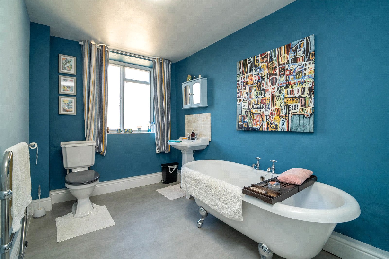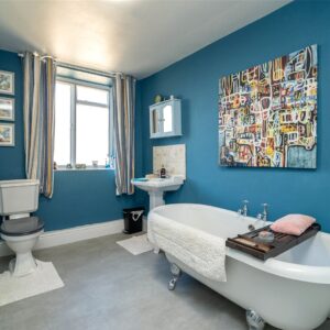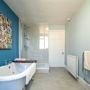 Upstairs, the home offers three well-proportioned double bedrooms, two with built-in storage, and a stylish family bathroom complete with a roll-top bath and a separate shower.