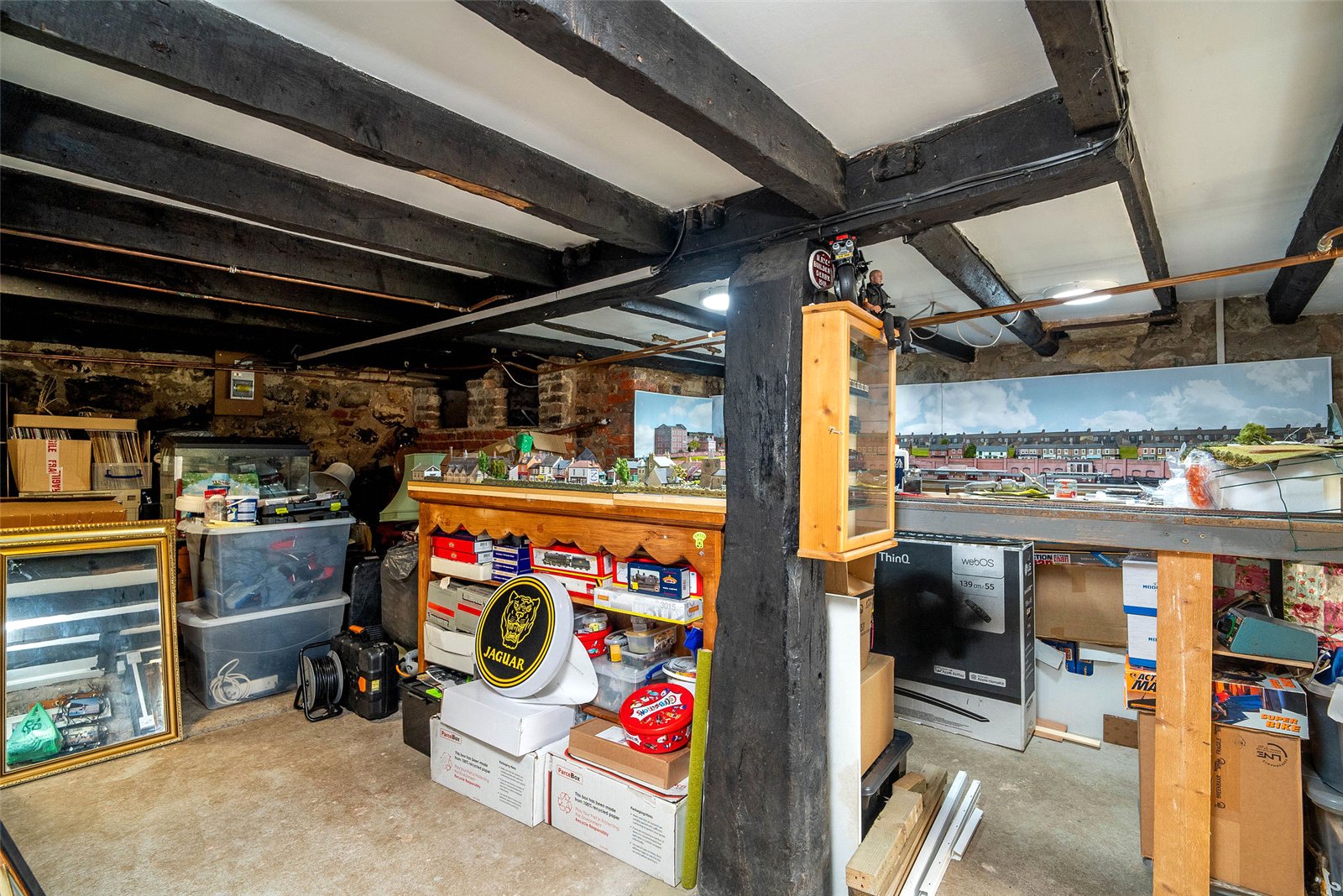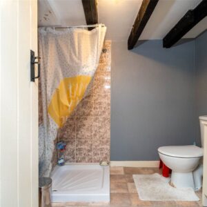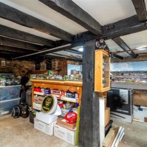 From the kitchen, steps lead down to a characterful conservatory with exposed stone walls and access to a useful walk-in store. This lower ground level also benefits from a separate shower room and a generous utility/storage room with plumbing for laundry appliances.