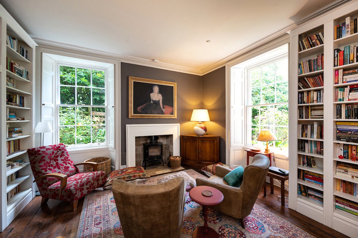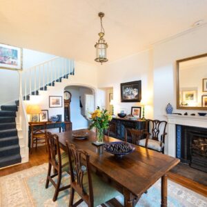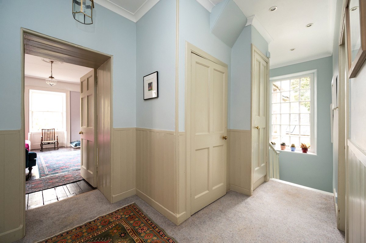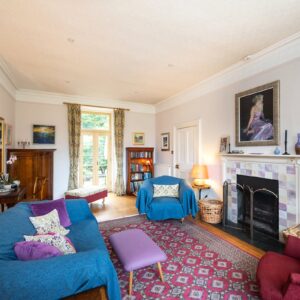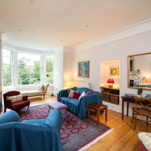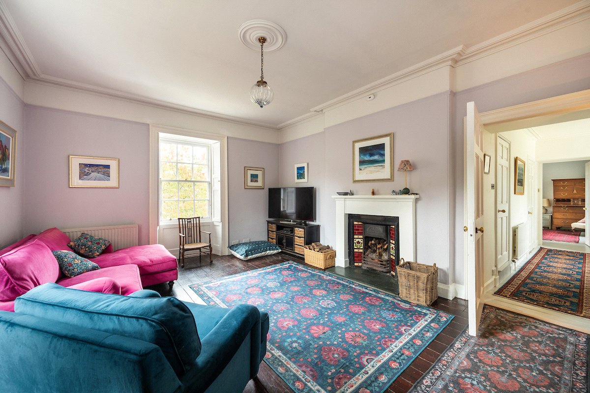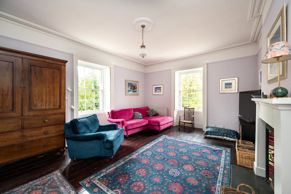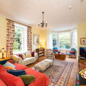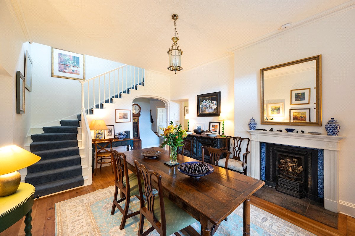 Inside, Haymount retains a wealth of period features, including cornicing, original fireplaces, panelled doors, working shutters, and decorative architraves. The main reception hallway is welcoming and characterful, with an open fireplace and ample space for a dining table or informal seating. Doors lead to two generous dual-aspect reception rooms at the front, both with large bay windows overlooking the garden. A formal staircase rises elegantly from the hall to the first floor, enhancing the grandeur of the entrance.