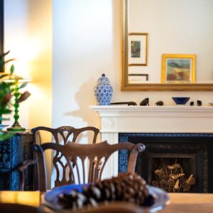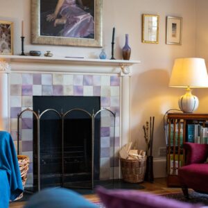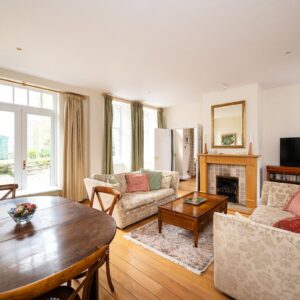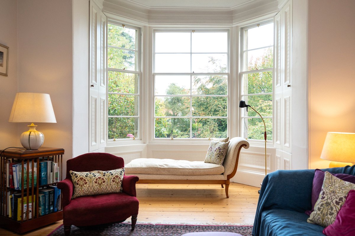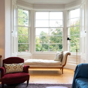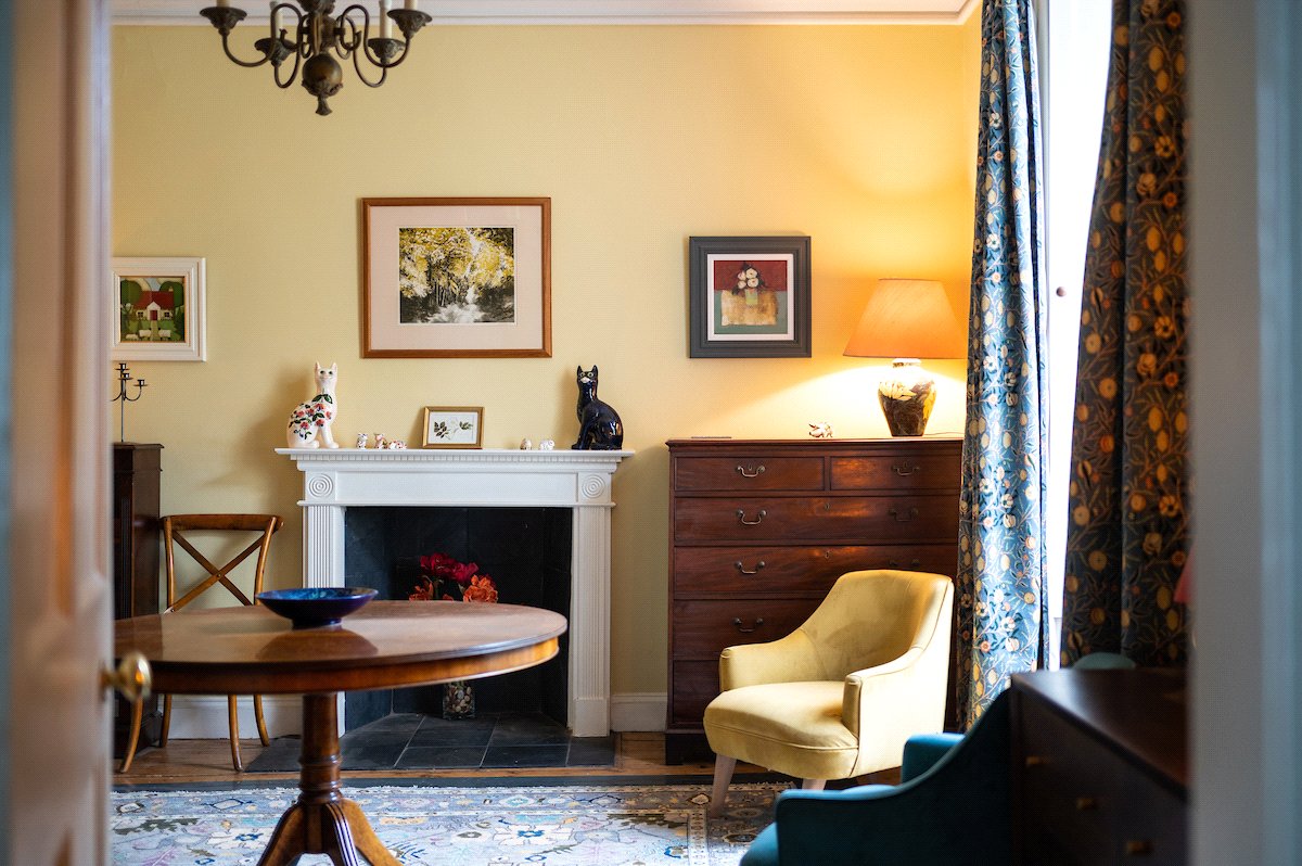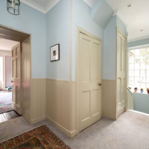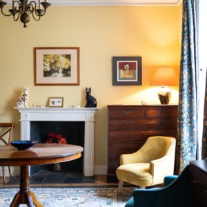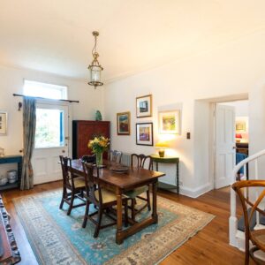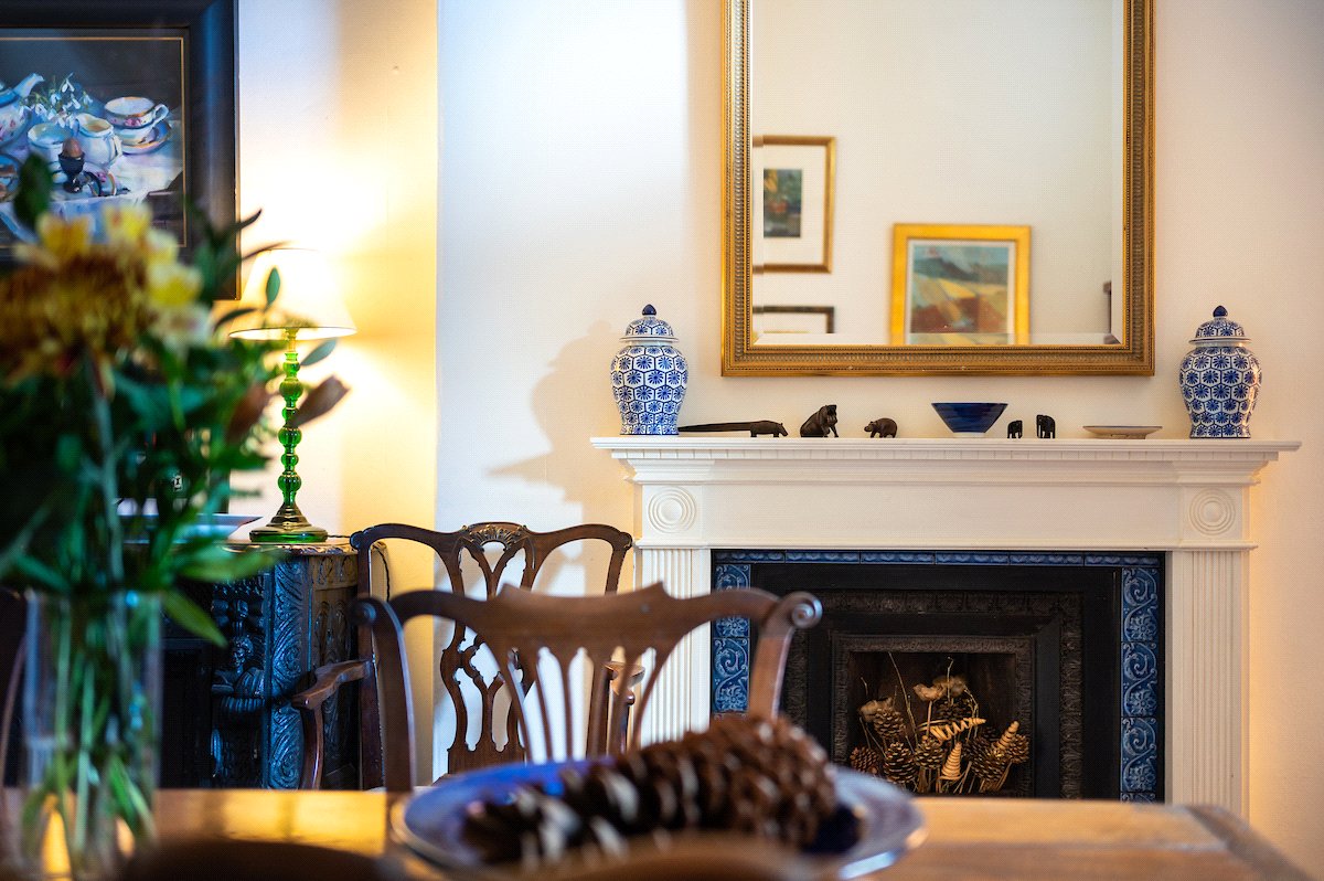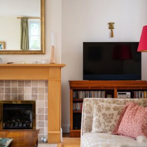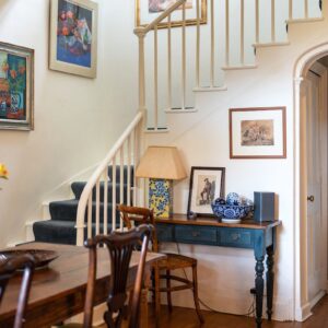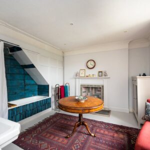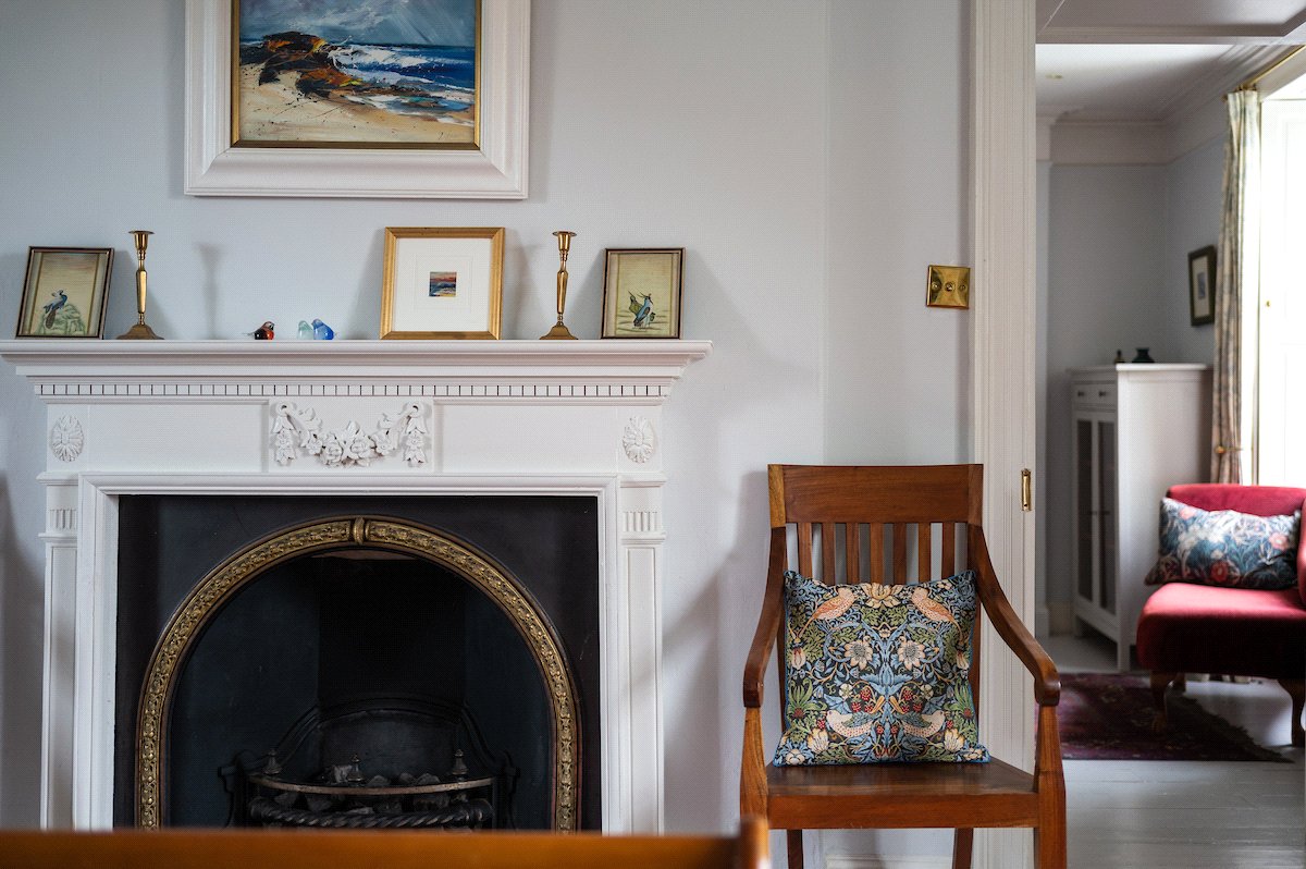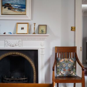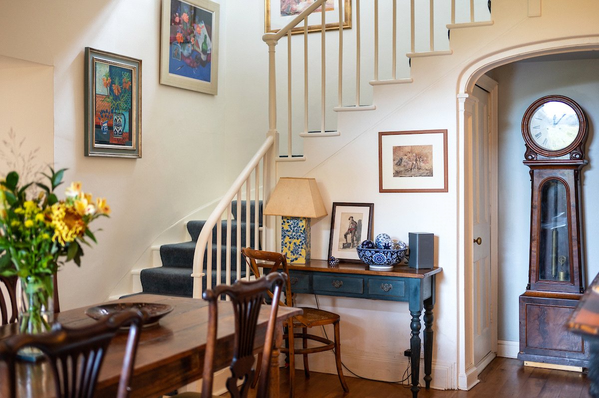 Inside, Haymount retains a wealth of period features, including cornicing, original fireplaces, panelled doors, working shutters, and decorative architraves. The main reception hallway is welcoming and characterful, with an open fireplace and ample space for a dining table or informal seating. Doors lead to two generous dual-aspect reception rooms at the front, both with large bay windows overlooking the garden. A formal staircase rises elegantly from the hall to the first floor, enhancing the grandeur of the entrance.