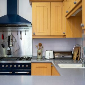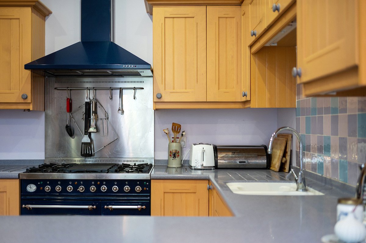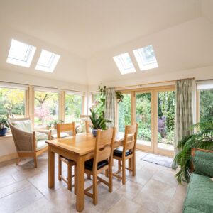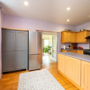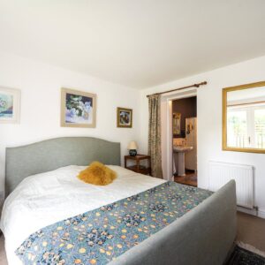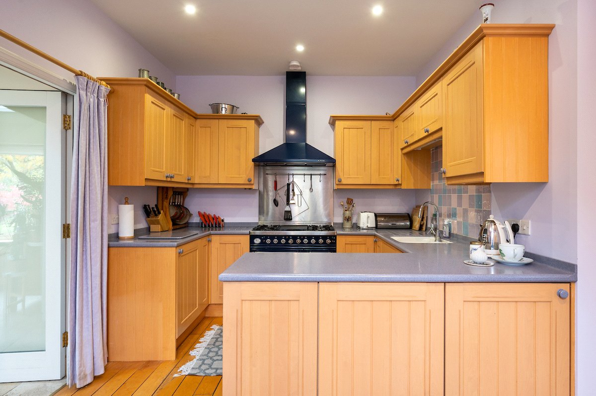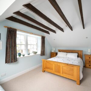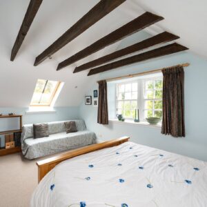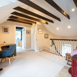 Inside, the accommodation is well-proportioned and thoughtfully designed, featuring a bright kitchen with integrated appliances and range cooker, a garden room with bi-fold doors, and a generous triple aspect sitting room. Upstairs, two double bedrooms with exposed beams are complemented by a stylish shower room and a generous landing area with a Juliet balcony creating a second reception room.