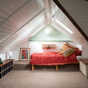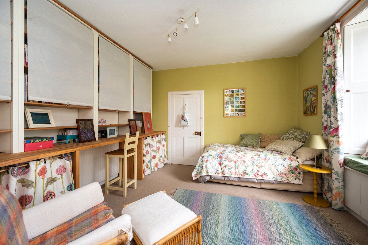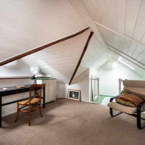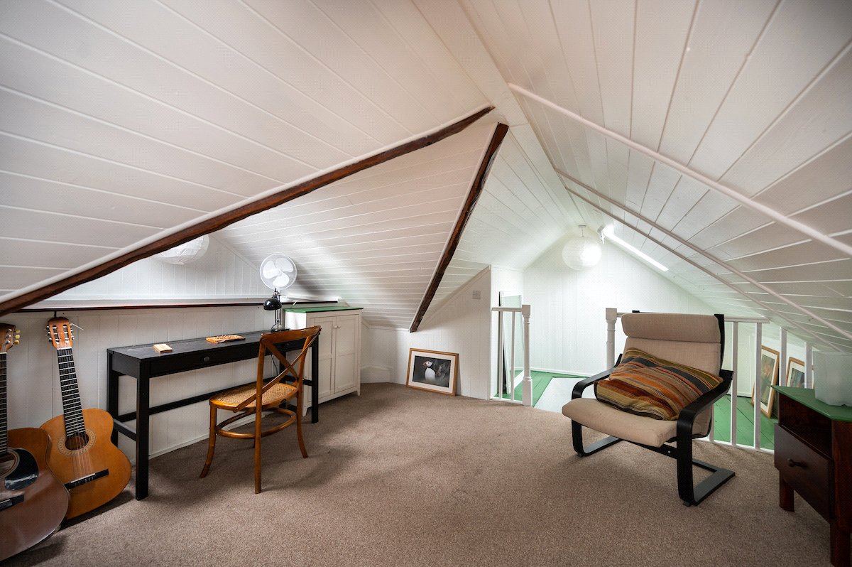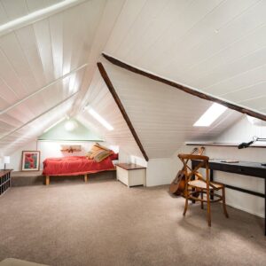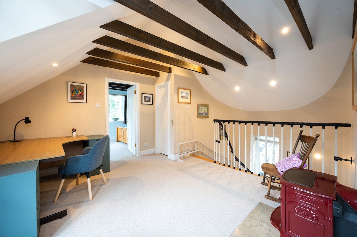 A concealed staircase leads to a sixth bedroom, ideal as a study or playroom, while a second hidden stair leads to a further attic room, currently used for storage but offering potential as a home office or hobby space.