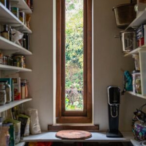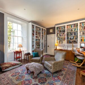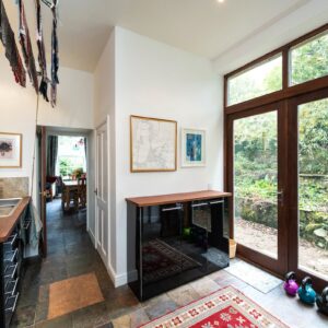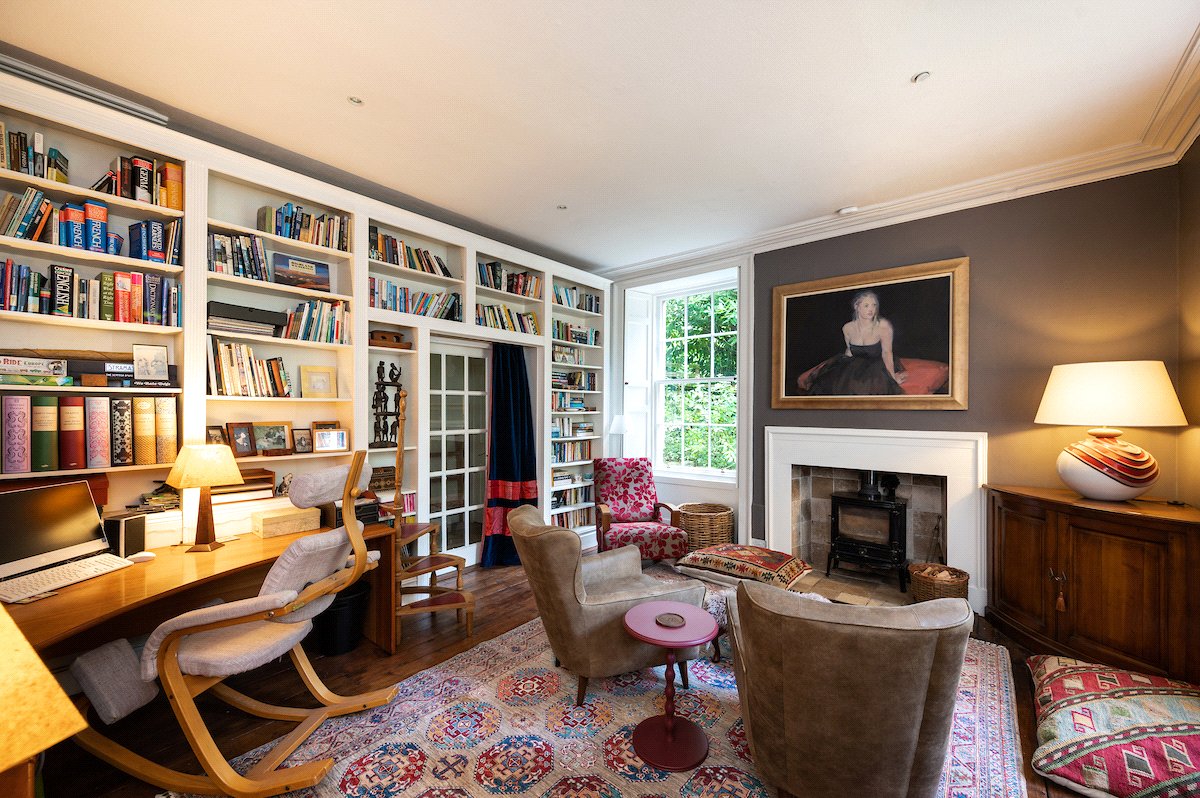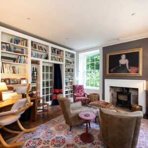 An internal corridor leads to the rear staircase, the kitchen, and a dual-aspect library with a wood-burning stove, which opens into a light-filled garden room. The layout continues to a utility room, pantry, and loops back to the kitchen, offering a natural and practical flow throughout the ground floor.