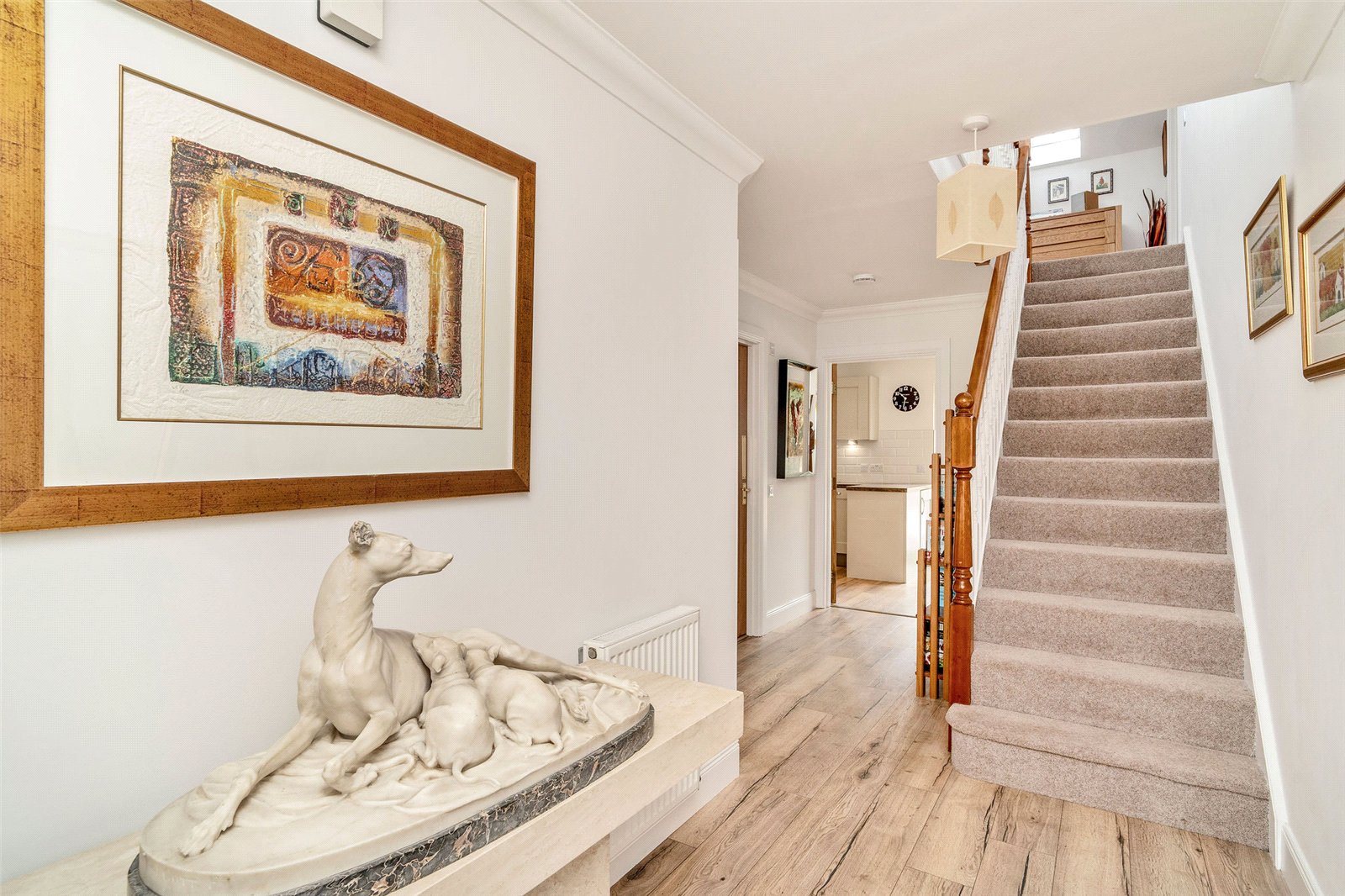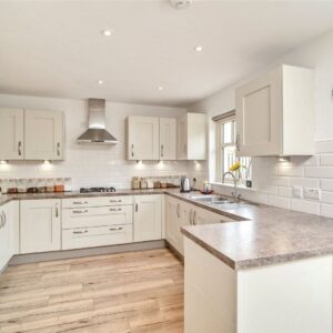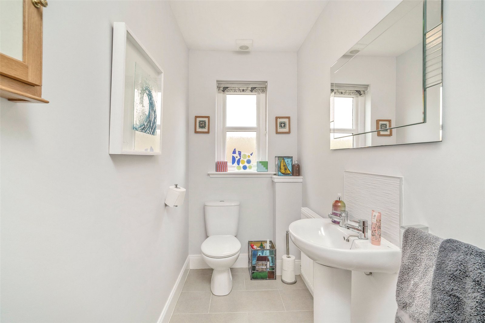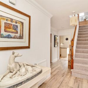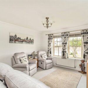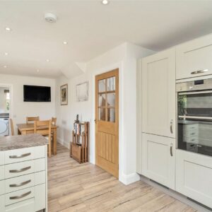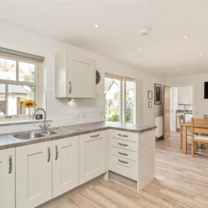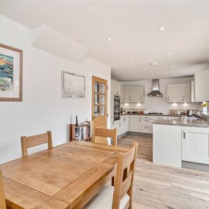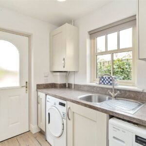 The entrance hall welcomes you into the home. To the left the sitting room overlooks the Green and the front garden, and features a central fireplace providing a warm focal point. Set to the rear, the open-plan dining kitchen is a generous and light-filled space with sliding doors opening directly to the rear patio, perfect for outdoor dining and entertaining. The kitchen is fitted with a range of units and integrated Siemens appliances, and there is an adjoining utility room offering additional workspace. From here, there is direct access into both the rear garden and the integral garage. A lit understairs cupboard provides further storage, and a useful cloakroom with WC completes the ground floor
