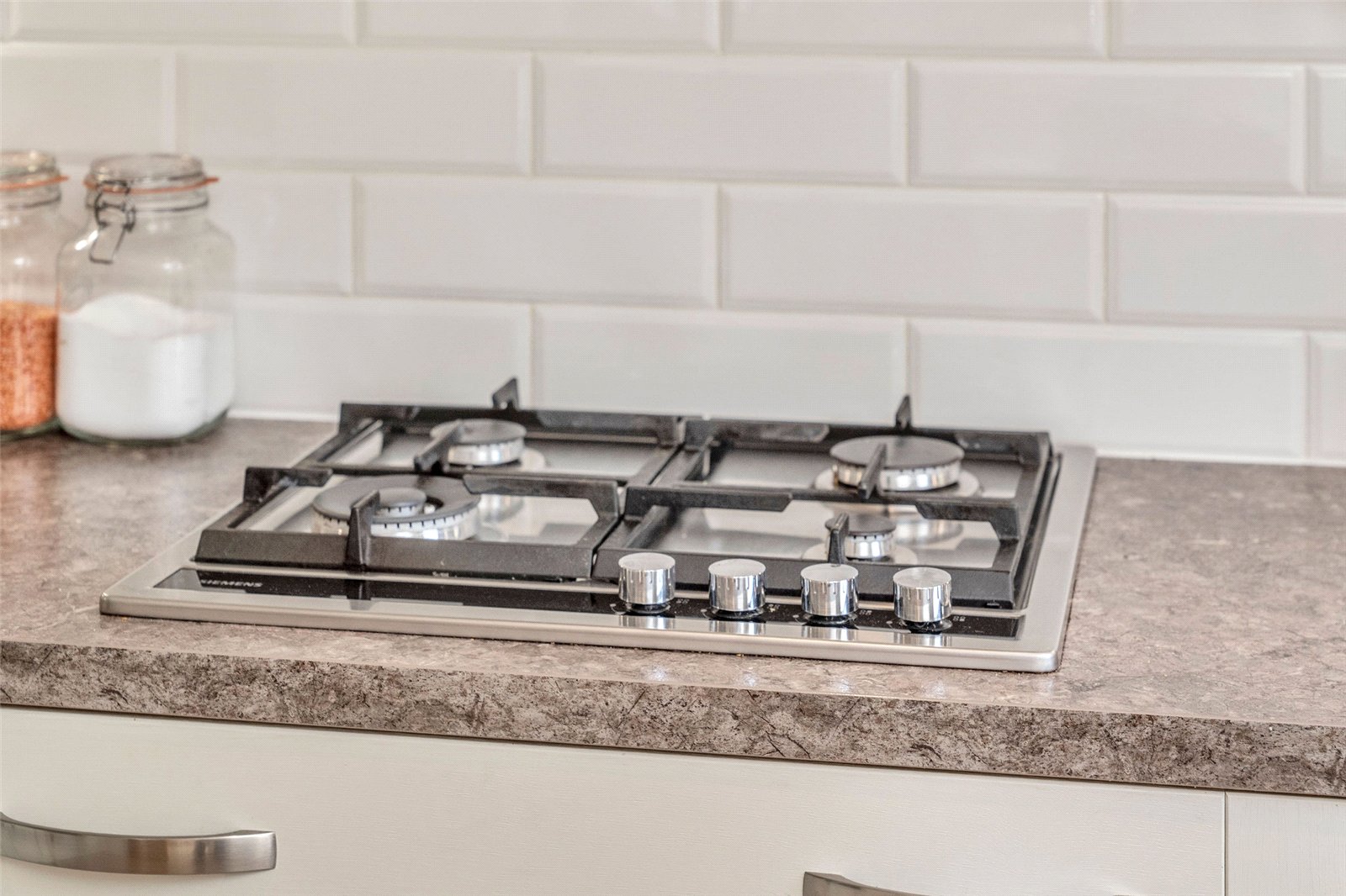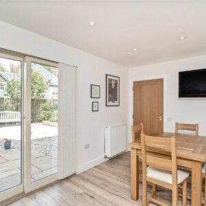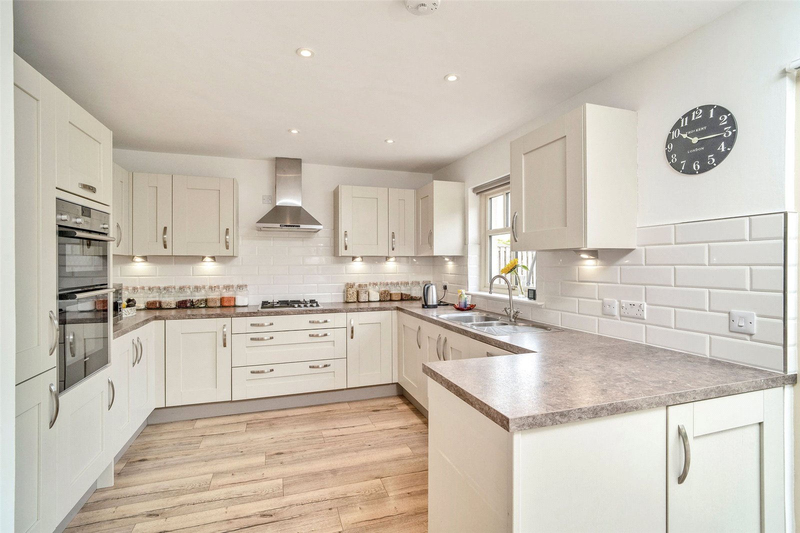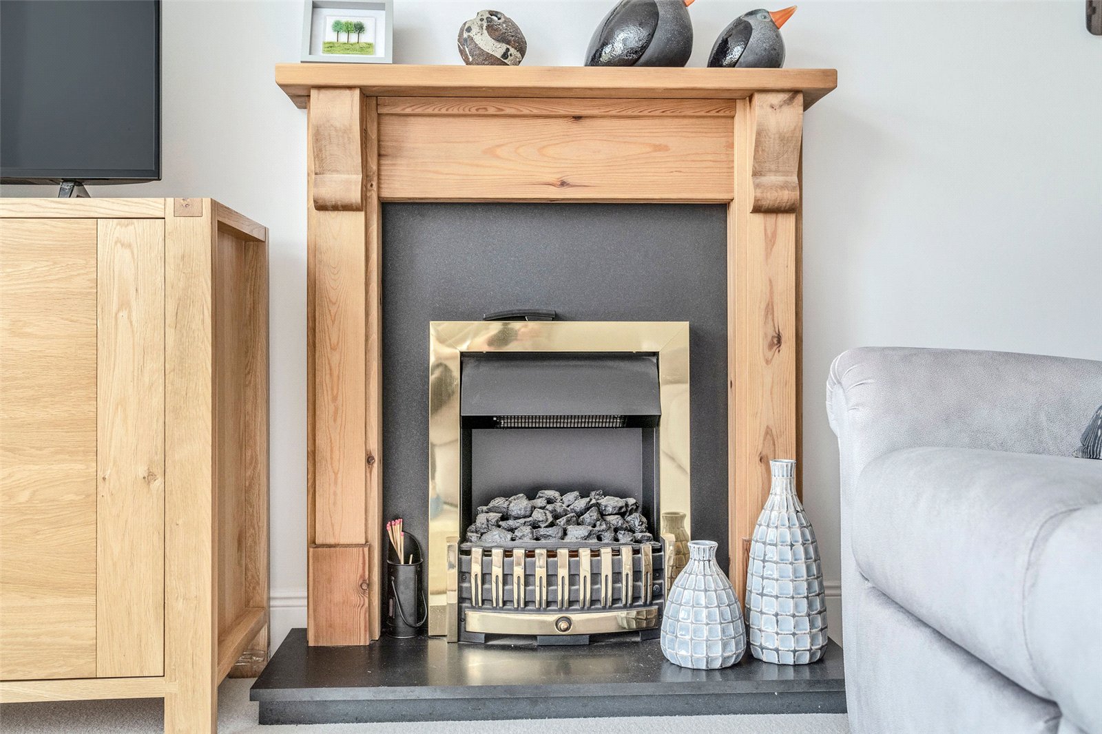 The entrance hall welcomes you into the home. To the left the sitting room overlooks the Green and the front garden, and features a central fireplace providing a warm focal point. Set to the rear, the open-plan dining kitchen is a generous and light-filled space with sliding doors opening directly to the rear patio, perfect for outdoor dining and entertaining. The kitchen is fitted with a range of units and integrated Siemens appliances, and there is an adjoining utility room offering additional workspace. From here, there is direct access into both the rear garden and the integral garage. A lit understairs cupboard provides further storage, and a useful cloakroom with WC completes the ground floor