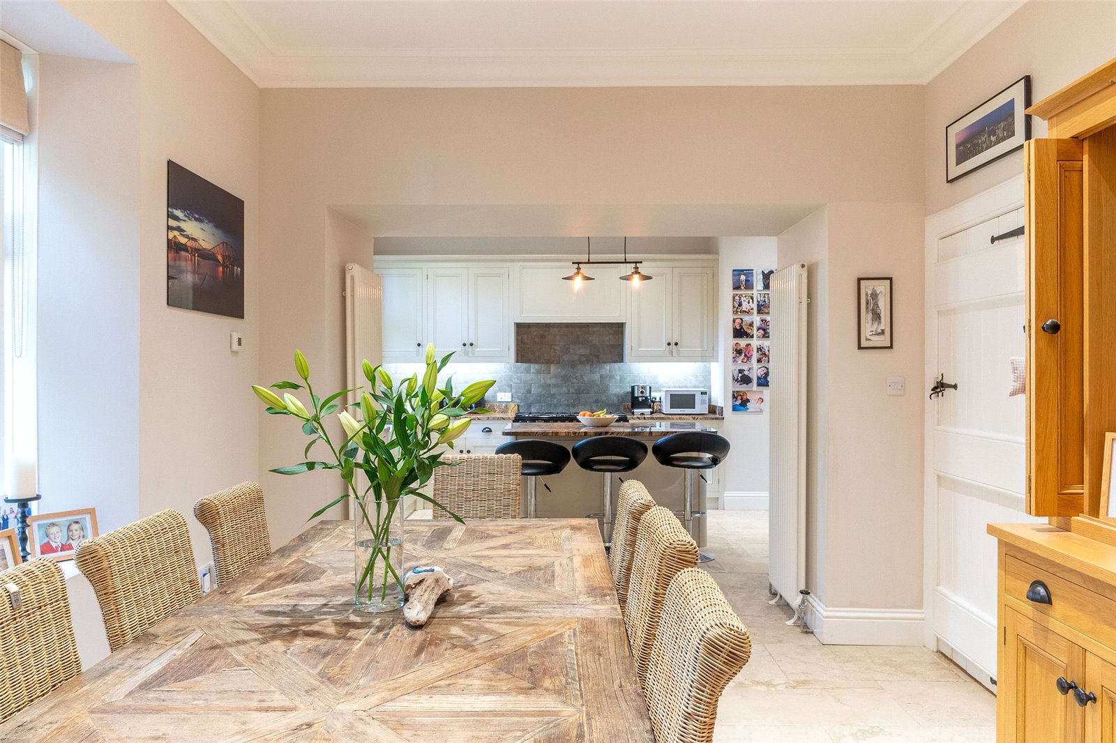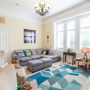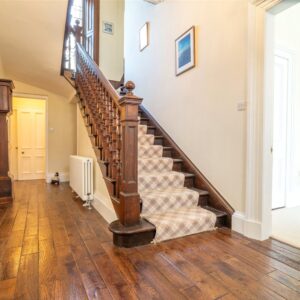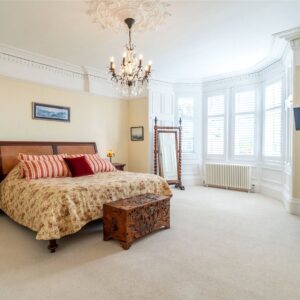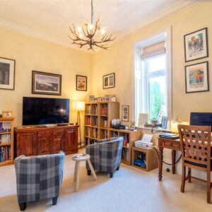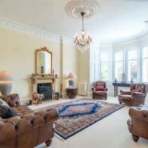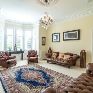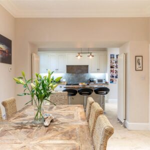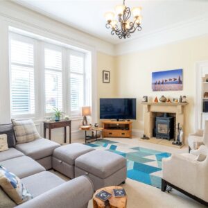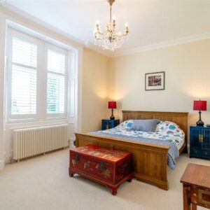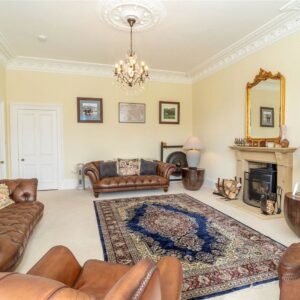 Mansefield seamlessly blends the convenience of modern living with timeless classical features. The home is adorned with ornate cornicing, original shutters, doors, and fireplaces that add to its unique charm. Upon entering, you are greeted by a welcoming vestibule that leads into a grand entrance hall with polished wooden floors. To the left, a comfortable sitting room invites relaxation, while a bright and spacious drawing room on the opposite side overlooks the front garden. Additionally, this level includes a versatile dining room/snug.