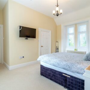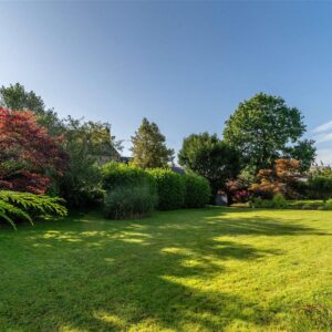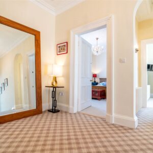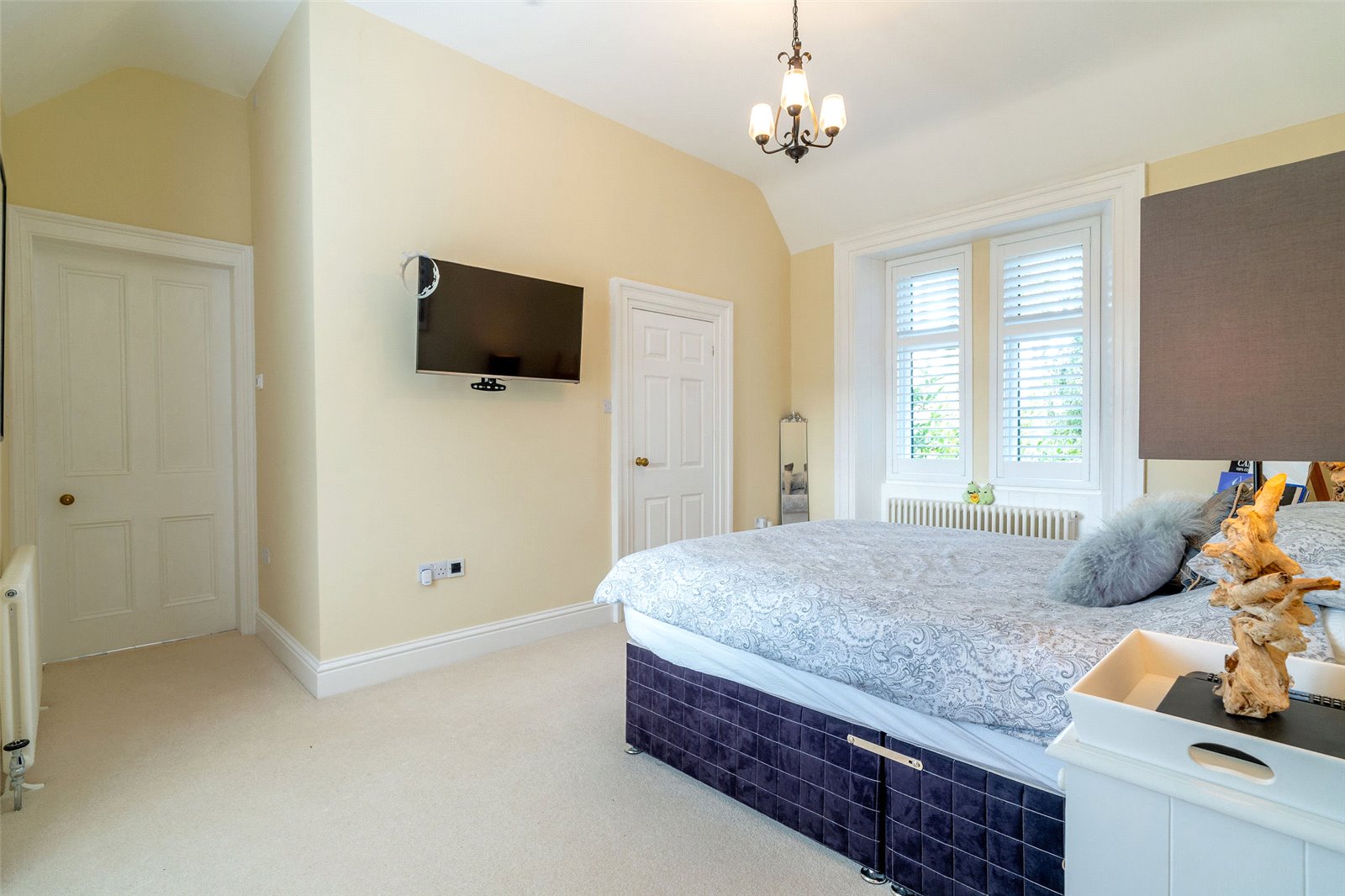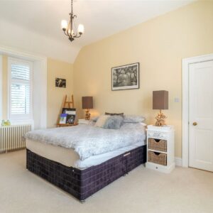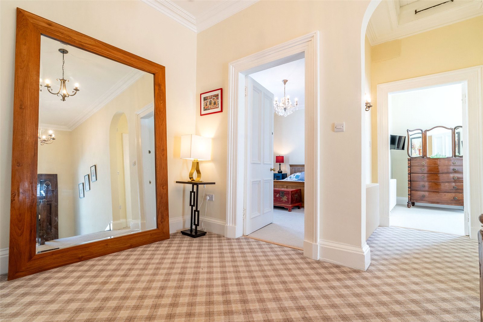 A fine staircase leads to a split-level landing, where steps to the right reveal a double bedroom complete with a walk-in wardrobe and an en-suite bathroom. The principal bedroom, overlooking the front of the property, offers the luxury of an en-suite bathroom and a dressing room. Two further generously proportioned double bedrooms—one with an en-suite shower room—ensure ample space for family or guests. The family bathroom completes the upper-level accommodation.