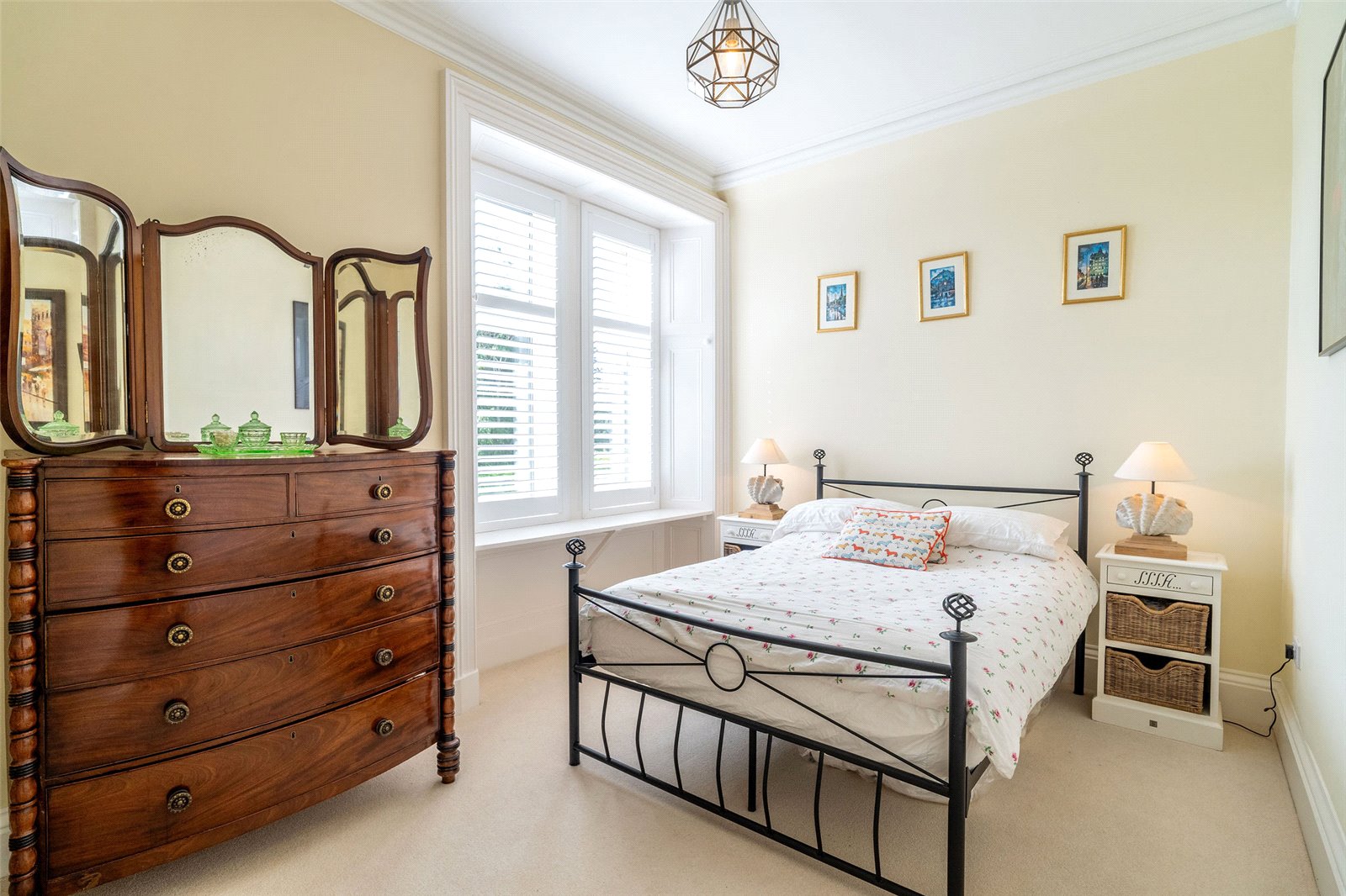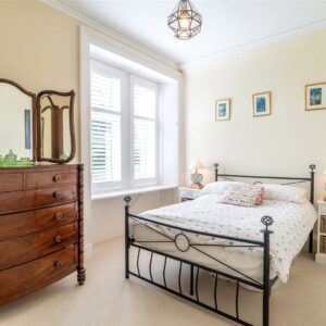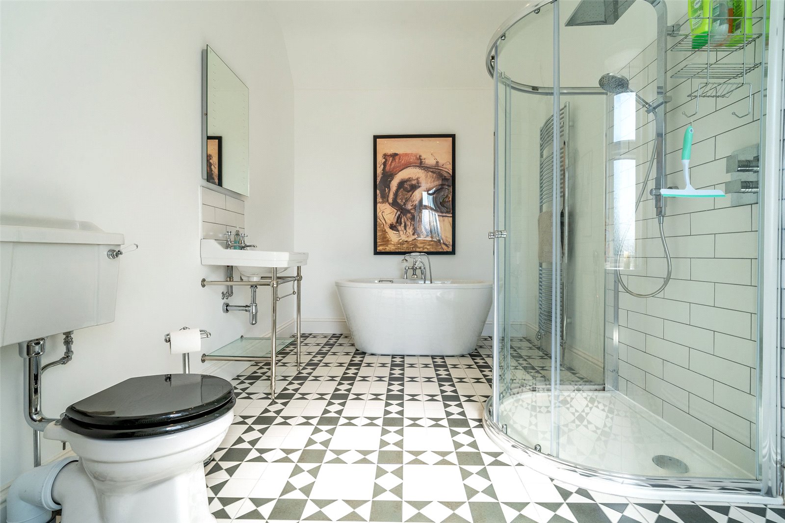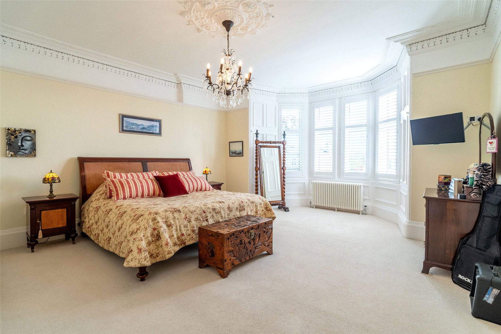 A fine staircase leads to a split-level landing, where steps to the right reveal a double bedroom complete with a walk-in wardrobe and an en-suite bathroom. The principal bedroom, overlooking the front of the property, offers the luxury of an en-suite bathroom and a dressing room. Two further generously proportioned double bedrooms—one with an en-suite shower room—ensure ample space for family or guests. The family bathroom completes the upper-level accommodation.