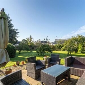Externally, a private driveway leads to the front of the property, where the garden is mainly laid to lawn and complemented by mature trees, bushes, and vibrant plants. A patio area provides the perfect spot for outdoor dining and relaxation, while a garage to the rear adds to the property's practicality.