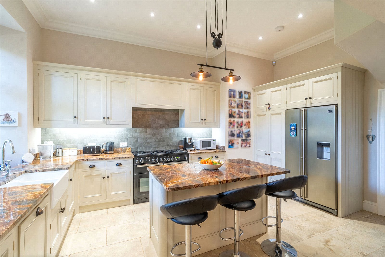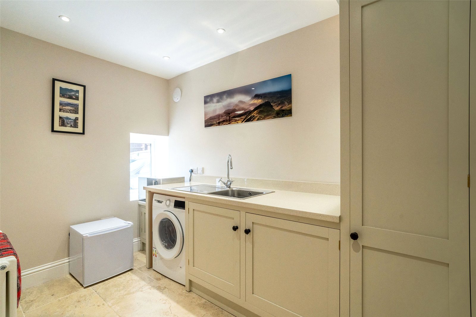 At the heart of the home lies the stunning dining kitchen, featuring a stylish range of wall and floor units, a double oven range cooker, a Belfast sink, a fridge freezer, and a kitchen island. A fitted dresser unit with a TV and a walk-in pantry enhance the kitchen's functionality. Beyond the kitchen, you will find a utility room, a second walk-in pantry, and a shower room with a WC, ensuring practicality and ease.