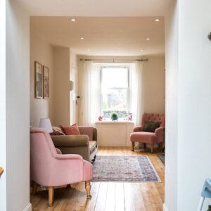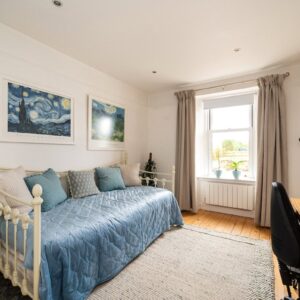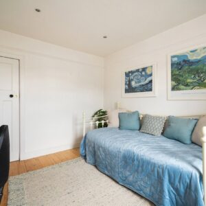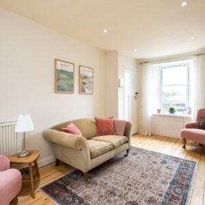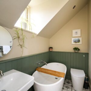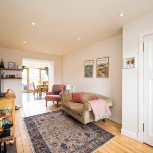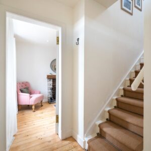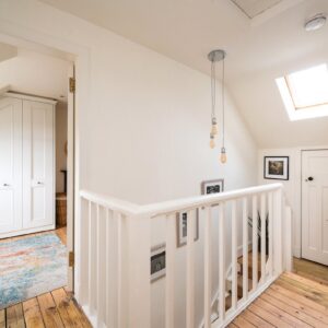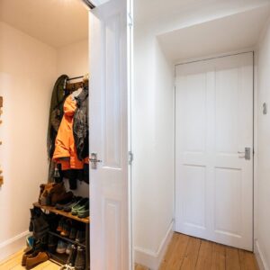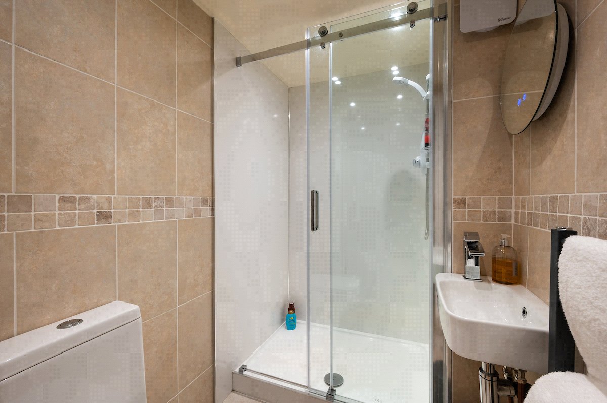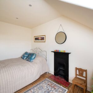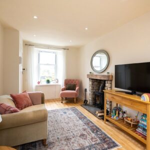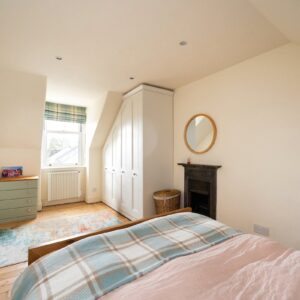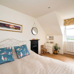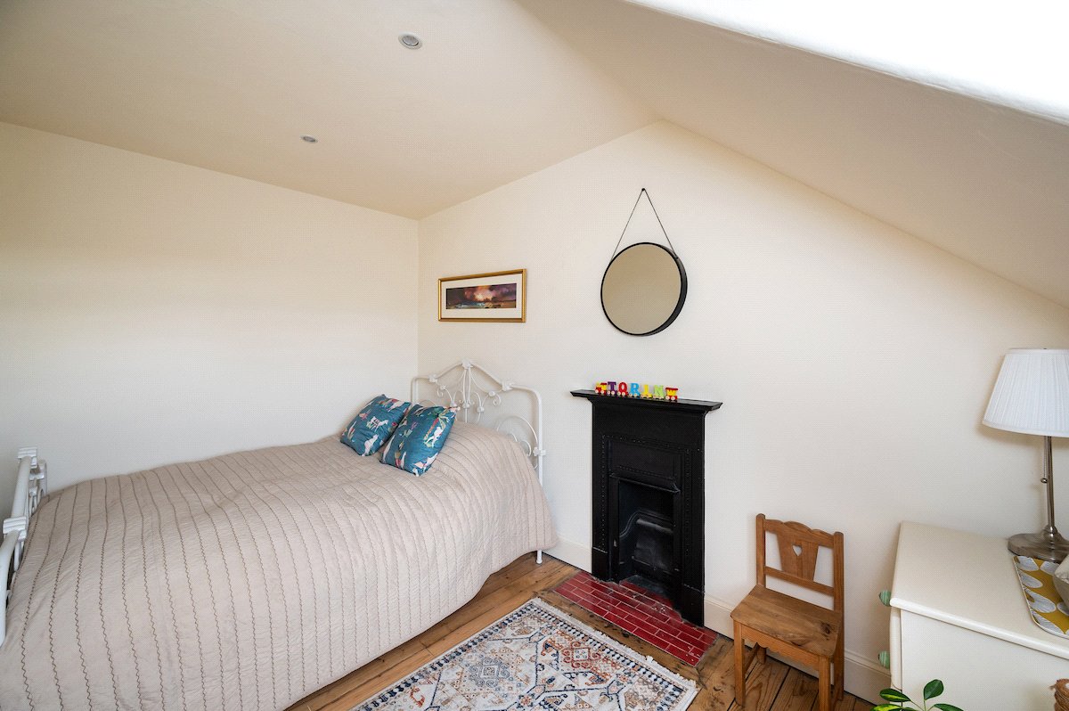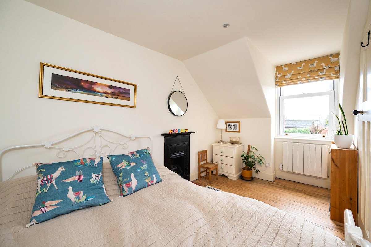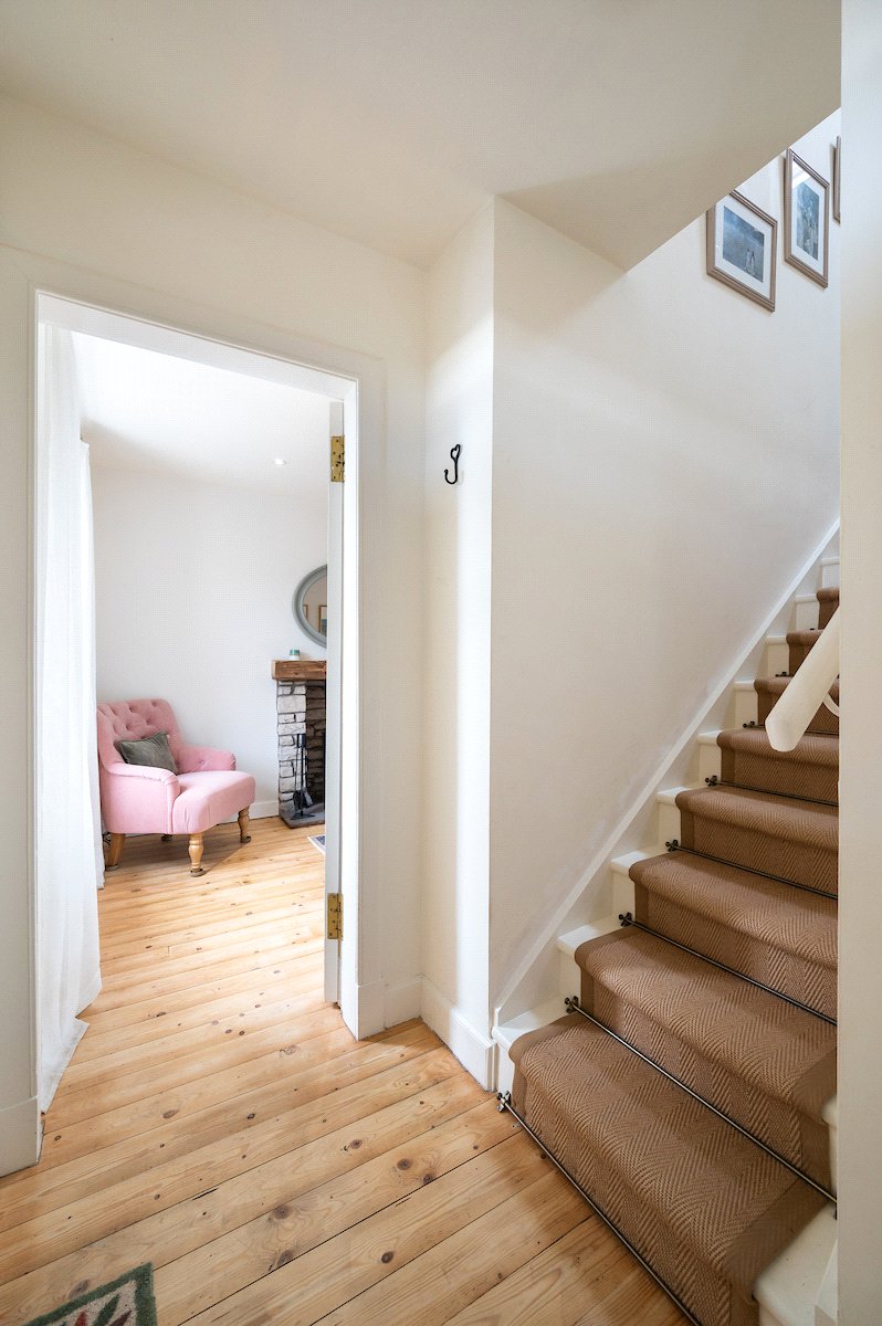 Upstairs, the first floor comprises two bedrooms and the family bathroom. The generous principal bedroom enjoys excellent proportions and natural light, while the second bedroom is a comfortable double bedroom with an open fire. The family bathroom is finished to a high standard and features a luxurious freestanding bath. The accommodation on this level is further enhanced by a large airing cupboard and additional eaves storage.