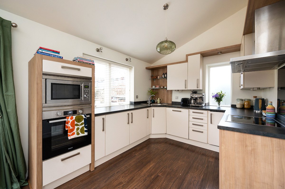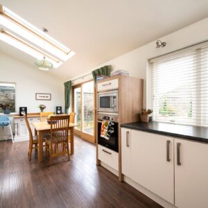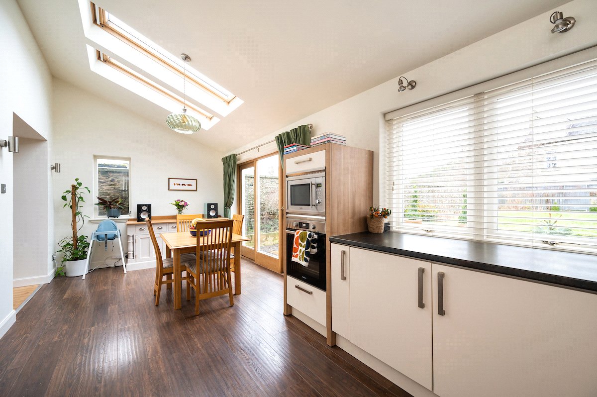 The ground floor opens into a welcoming entrance hall with staircase to the upper level. To the left, a bright and comfortable living room provides an inviting setting for relaxation. To the rear, the impressive dining kitchen spans the width of the property, creating a wonderful heart of the home with ample space for both cooking and entertaining. Large French doors flood the room with natural light and provide direct access to the garden. A centrally positioned utility room offers excellent additional storage and laundry facilities, along with access to a convenient ground floor shower room. Completing the ground floor is a well-proportioned double bedroom, which could equally serve as a guest room, home office or playroom.