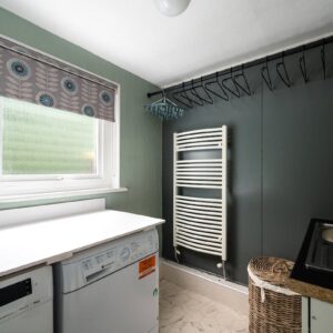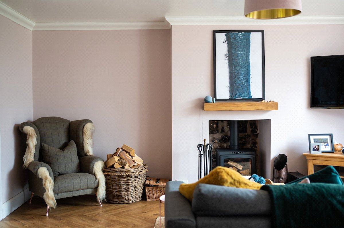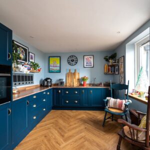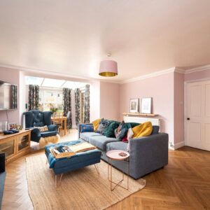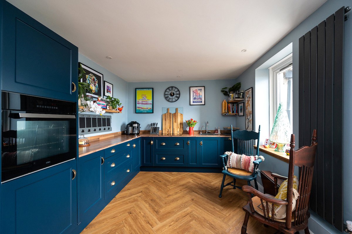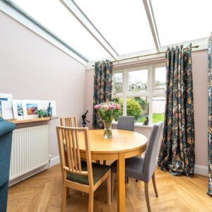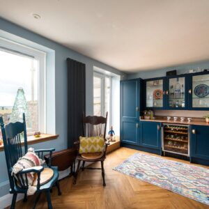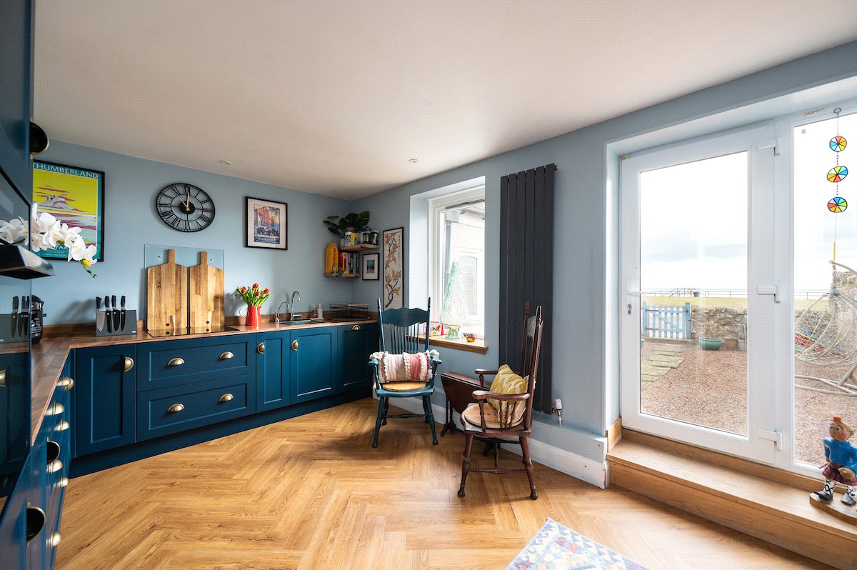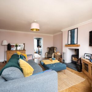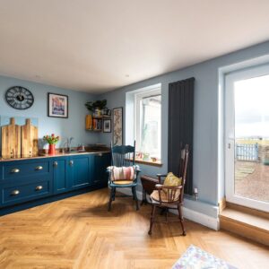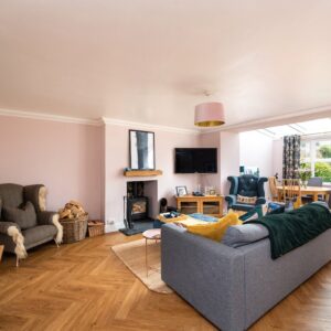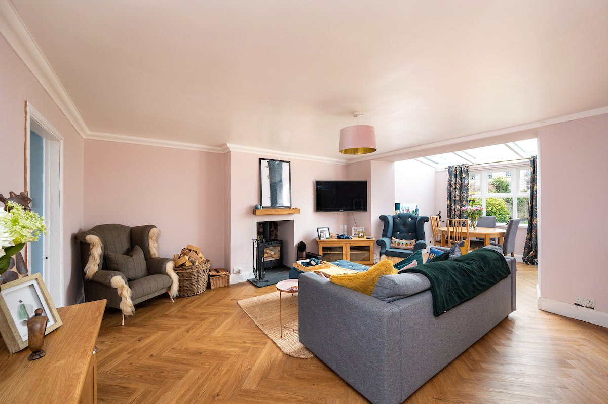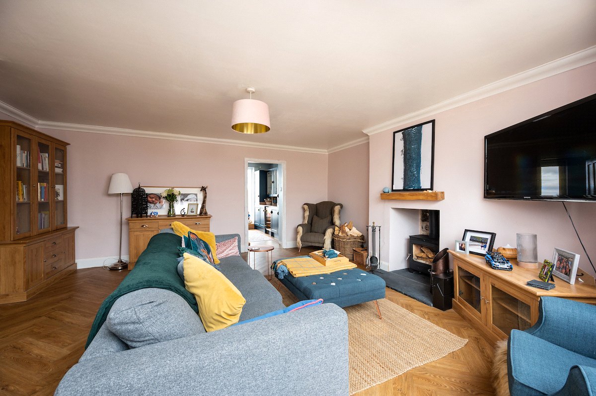 Internally, the property is arranged around a central hallway accessed via an entrance vestibule. To the front, a bright garden room overlooks the front garden and opens into a generous sitting room featuring a multi-fuel stove. The contemporary kitchen is fitted with navy shaker-style cabinetry, integrated appliances and herringbone flooring, with direct access to the rear courtyard.