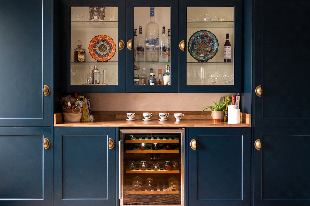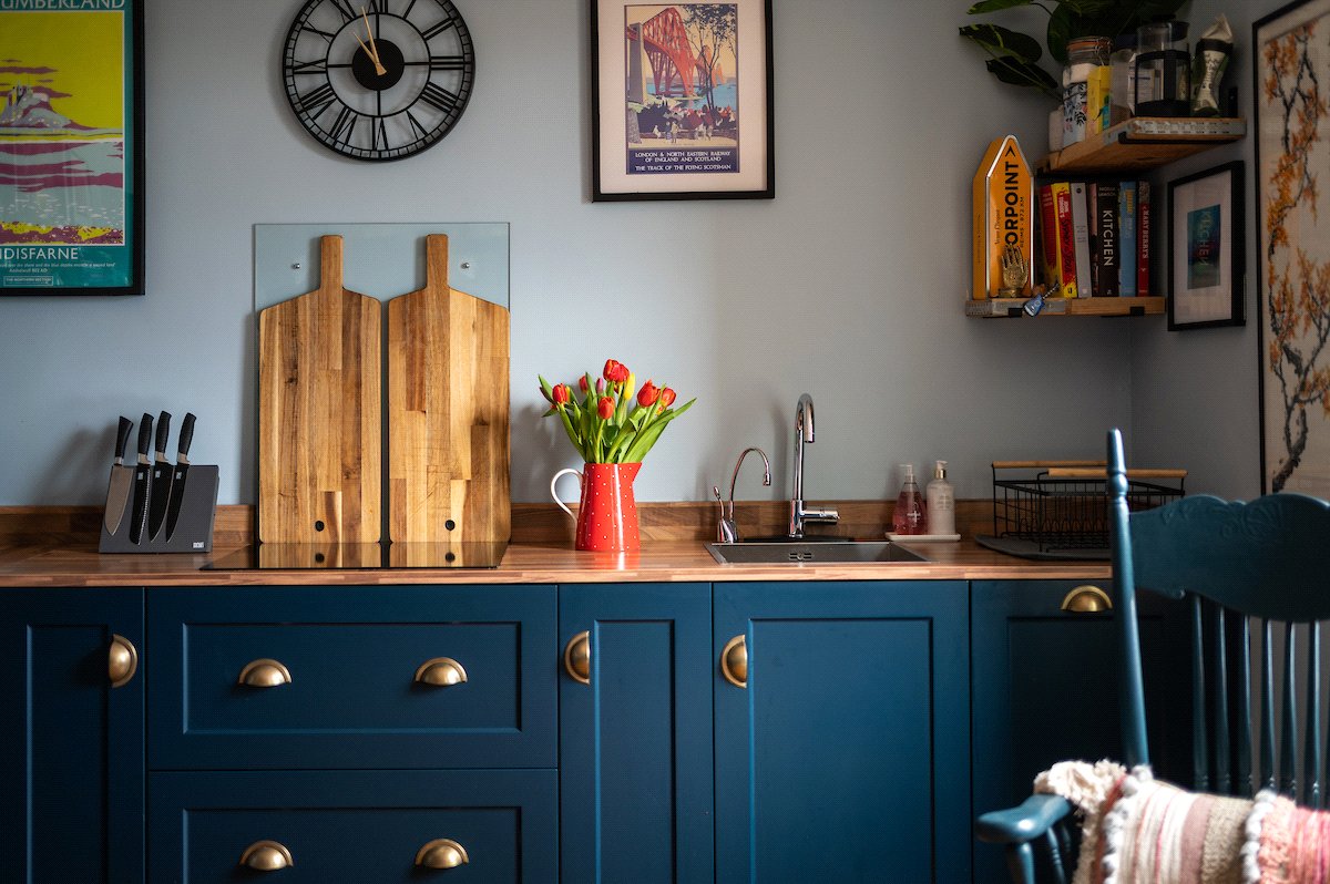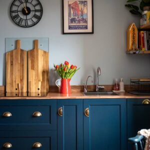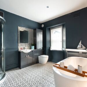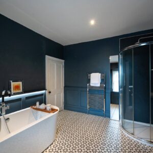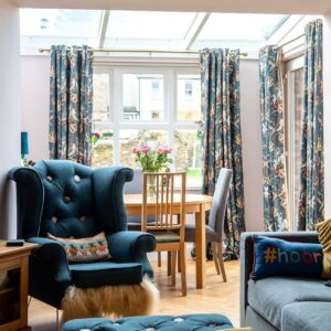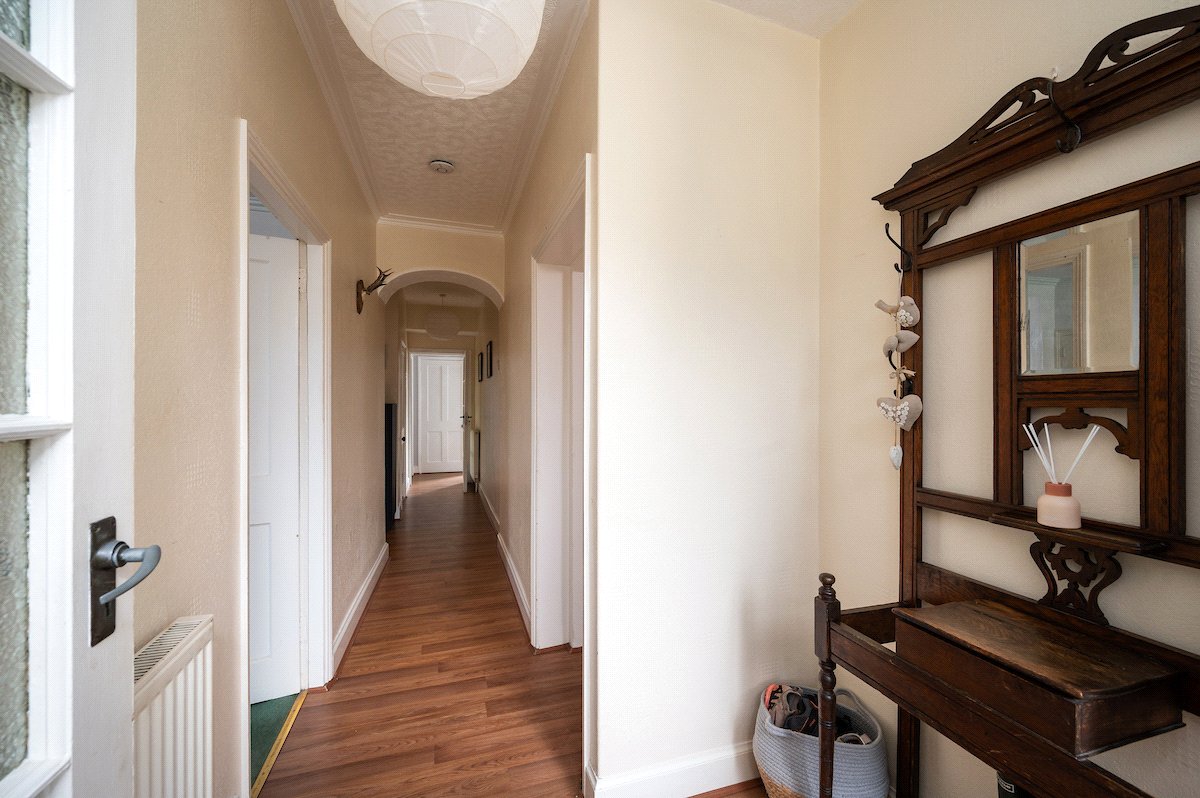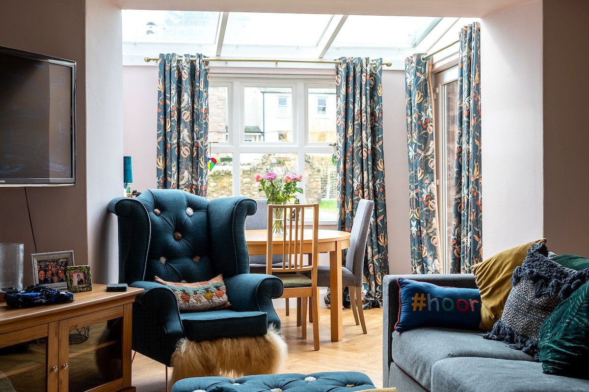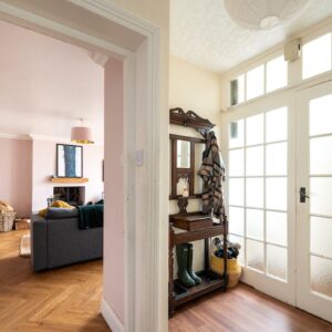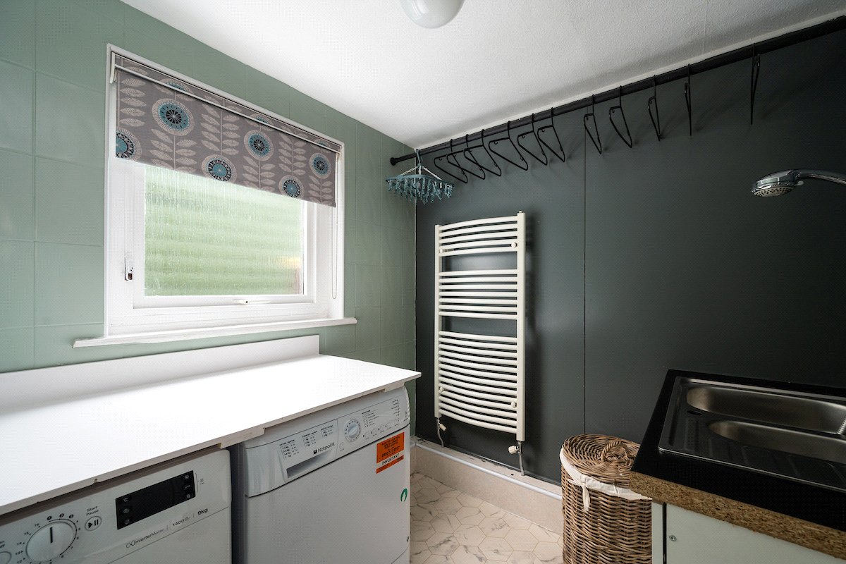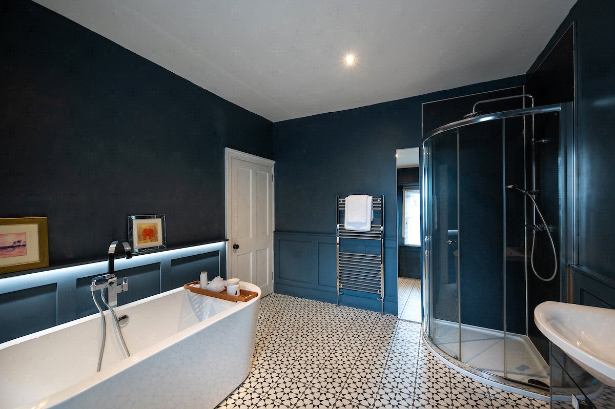 Internally, the property is arranged around a central hallway accessed via an entrance vestibule. To the front, a bright garden room overlooks the front garden and opens into a generous sitting room featuring a multi-fuel stove. The contemporary kitchen is fitted with navy shaker-style cabinetry, integrated appliances and herringbone flooring, with direct access to the rear courtyard.