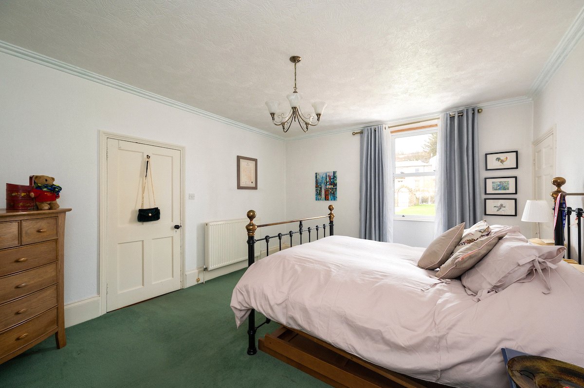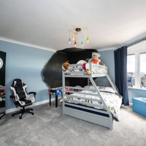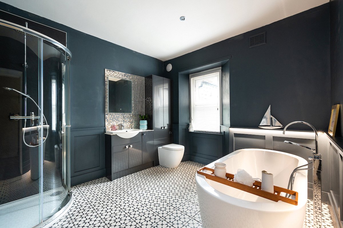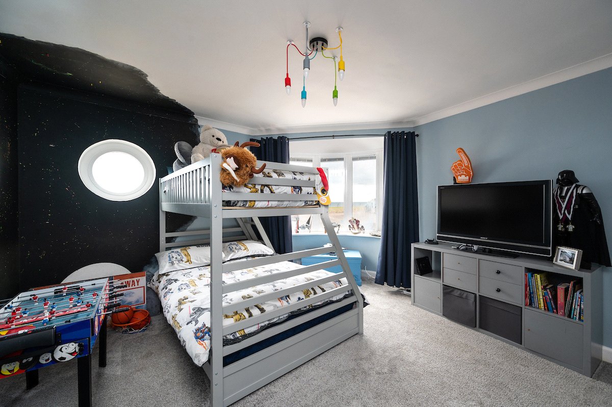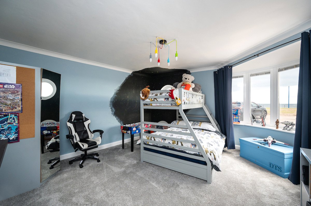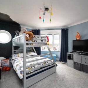The principal bedroom is generously proportioned and offers ample storage. The luxurious family bathroom includes a freestanding bath, a large walk-in shower with a waterfall head, and striking mosaic tiling. To the rear, a second spacious double bedroom features a charming porthole window framing views of the pier and lighthouse, alongside a separate utility room.