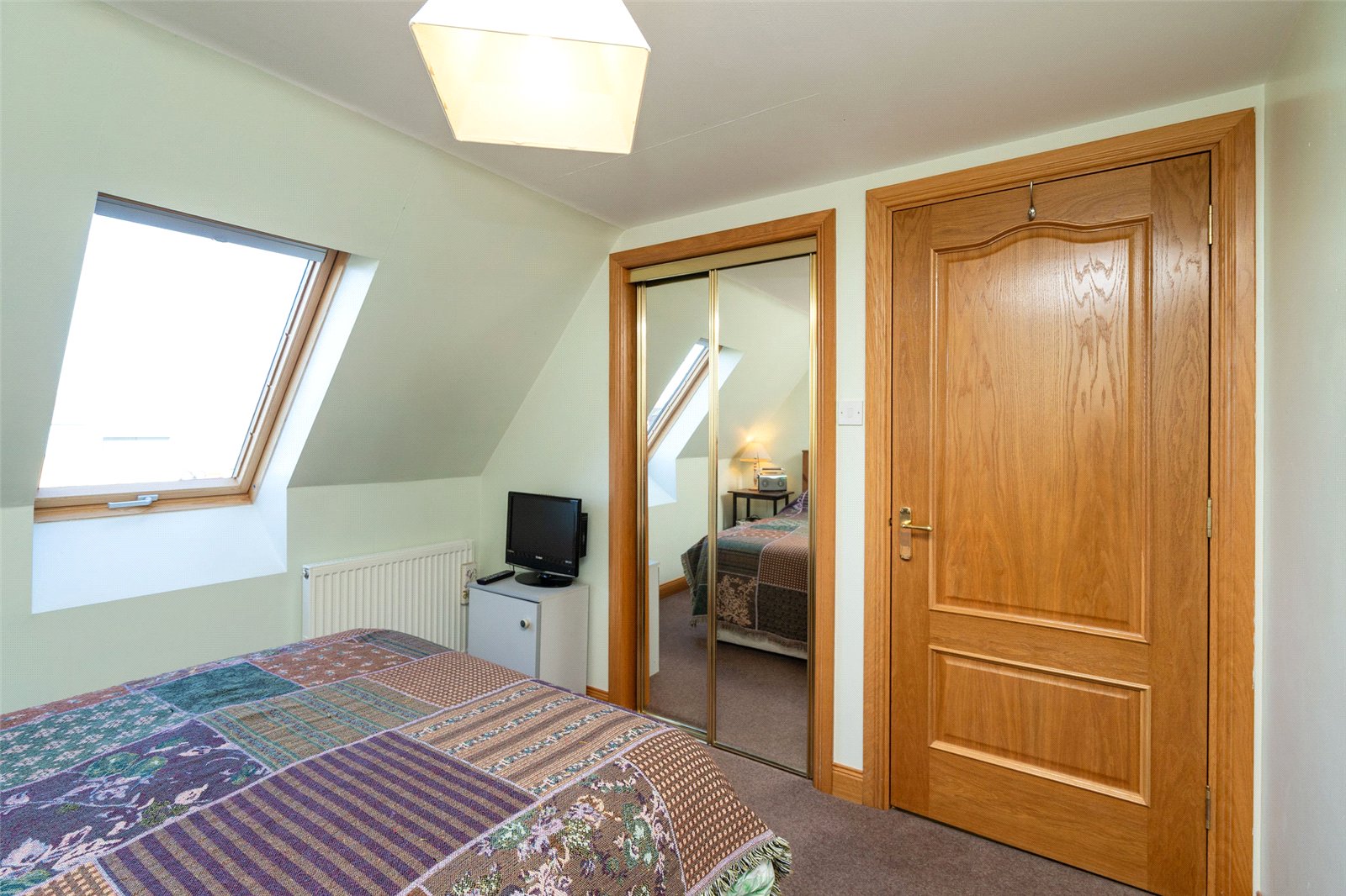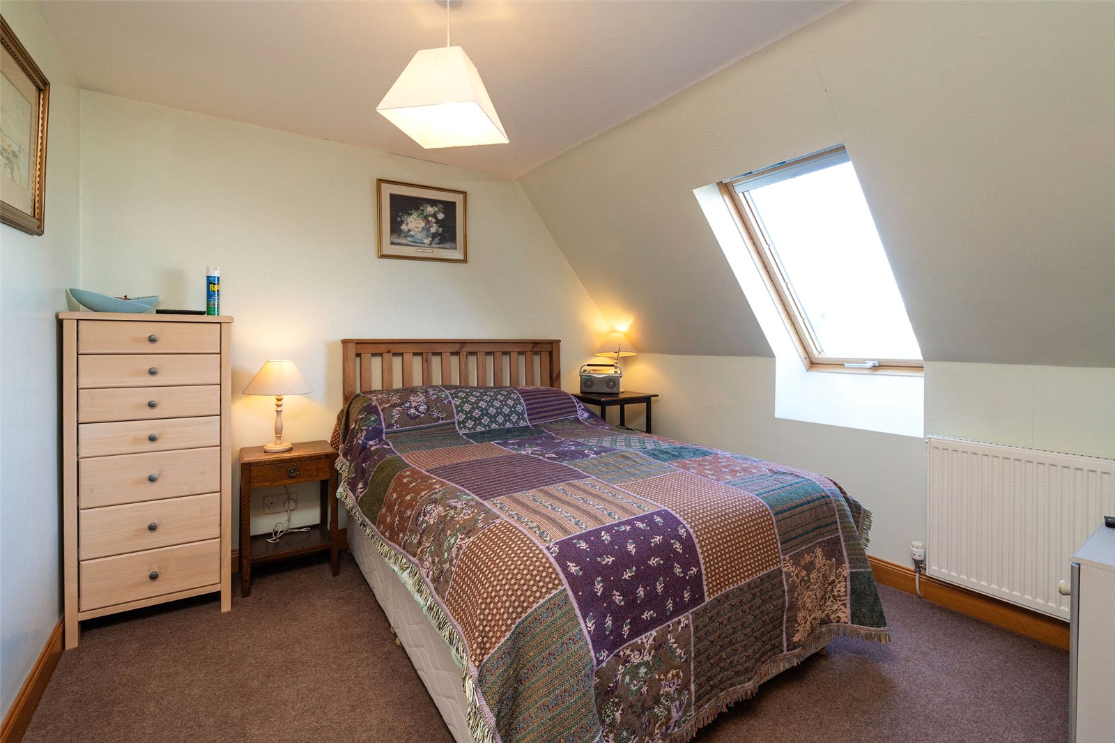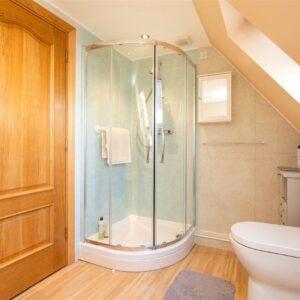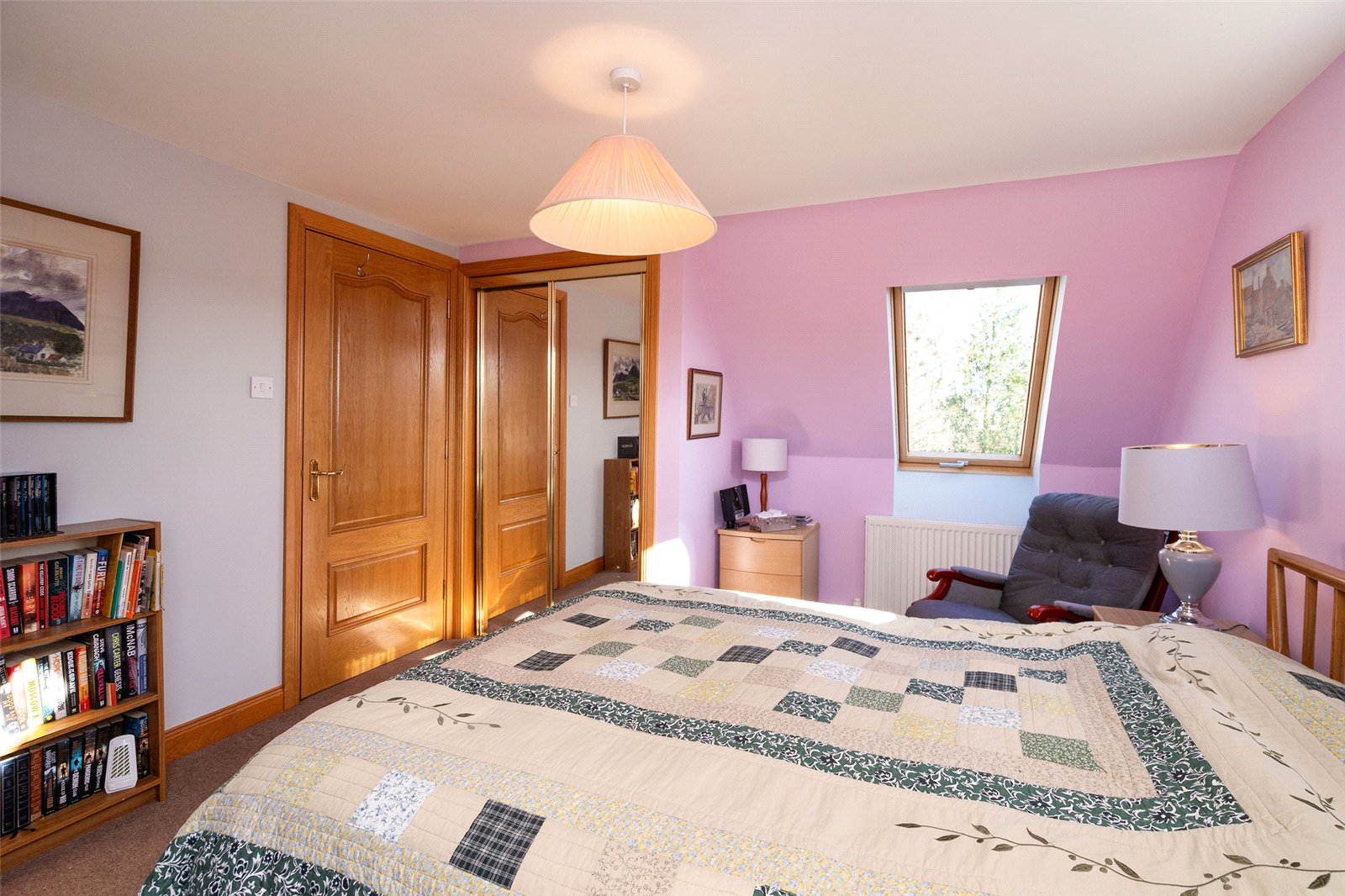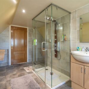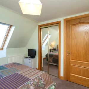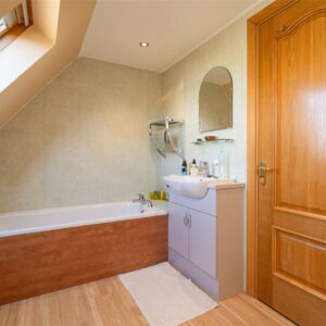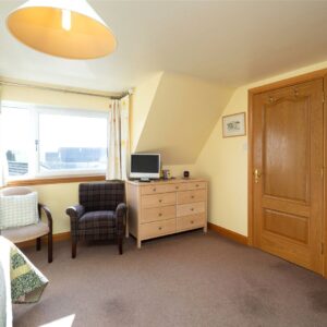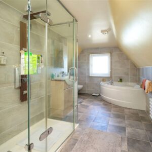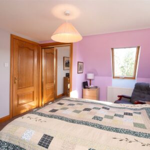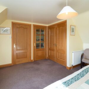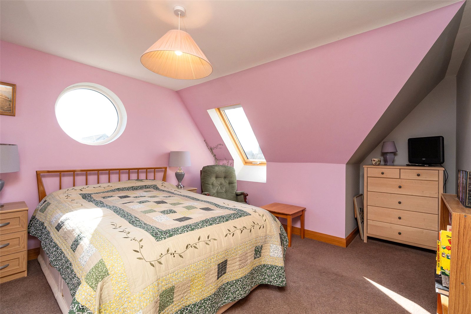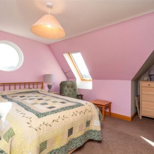 Upstairs, the first floor hosts three well-proportioned bedrooms. The principal bedroom benefits from a generous en-suite bathroom featuring both a separate shower and a Jacuzzi bath, along with ample built-in storage. Two further bedrooms are served by a family bathroom, with one of these rooms enjoying triple-aspect views and a distinctive circular window that adds character and charm. The landing area also provides access to additional storage cupboards, ensuring the home remains both functional and well organised.