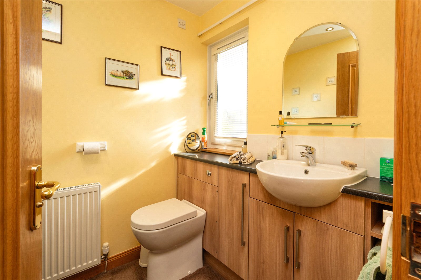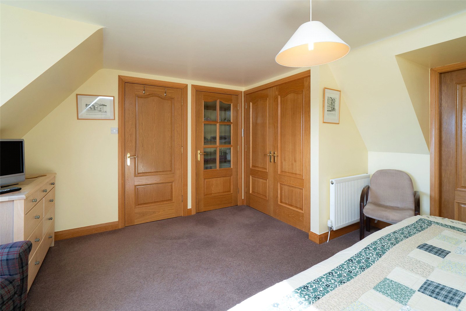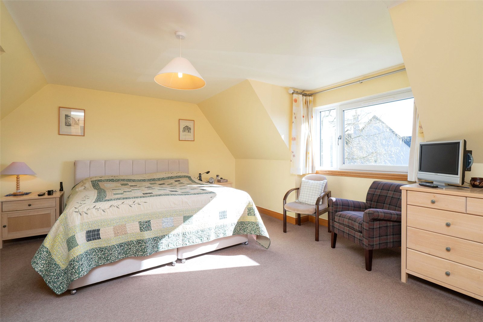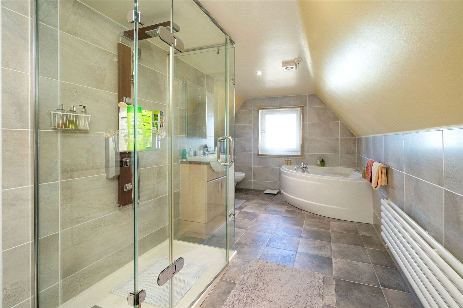 Upstairs, the first floor hosts three well-proportioned bedrooms. The principal bedroom benefits from a generous en-suite bathroom featuring both a separate shower and a Jacuzzi bath, along with ample built-in storage. Two further bedrooms are served by a family bathroom, with one of these rooms enjoying triple-aspect views and a distinctive circular window that adds character and charm. The landing area also provides access to additional storage cupboards, ensuring the home remains both functional and well organised.
