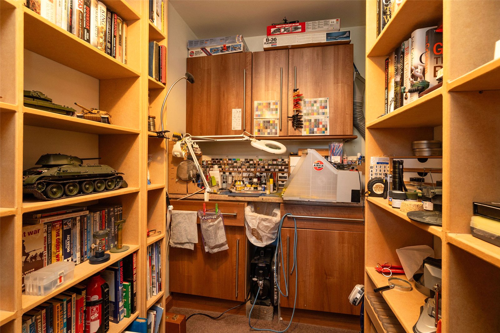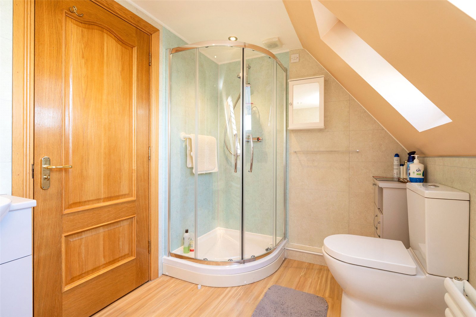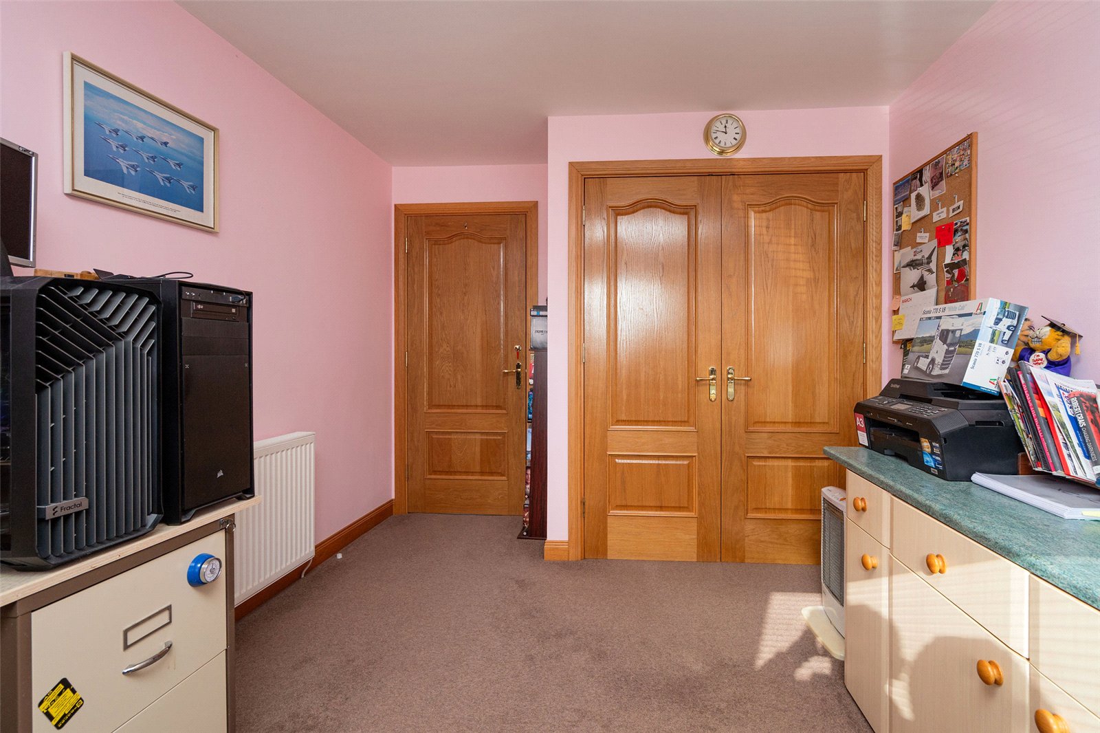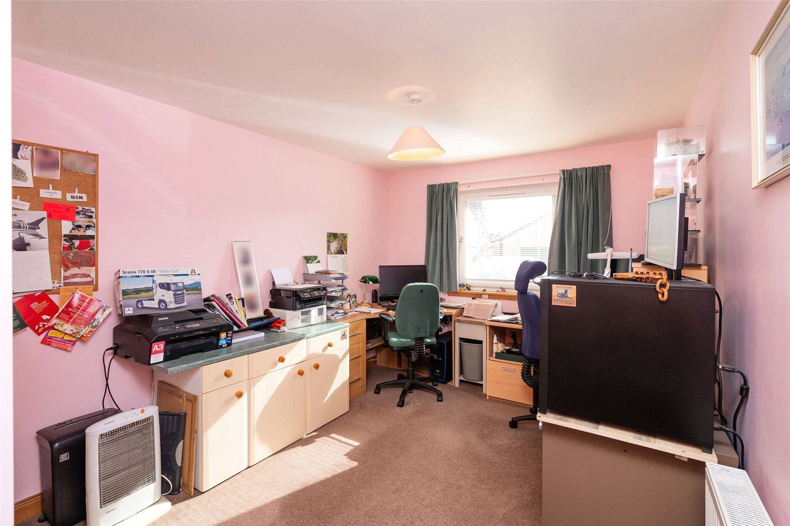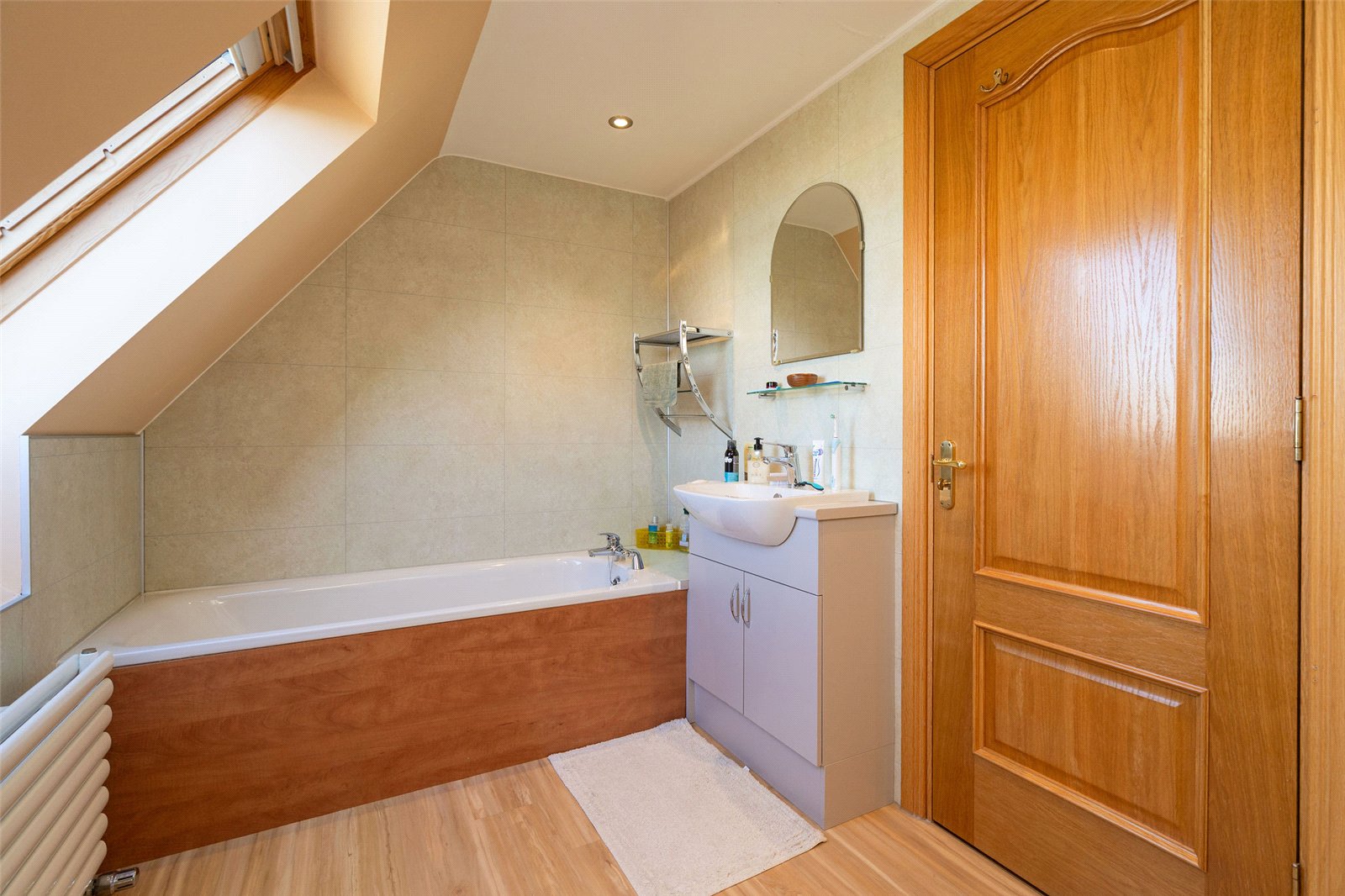 Upstairs, the first floor hosts three well-proportioned bedrooms. The principal bedroom benefits from a generous en-suite bathroom featuring both a separate shower and a Jacuzzi bath, along with ample built-in storage. Two further bedrooms are served by a family bathroom, with one of these rooms enjoying triple-aspect views and a distinctive circular window that adds character and charm. The landing area also provides access to additional storage cupboards, ensuring the home remains both functional and well organised.