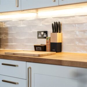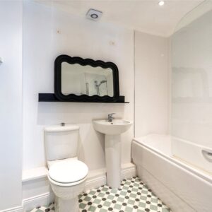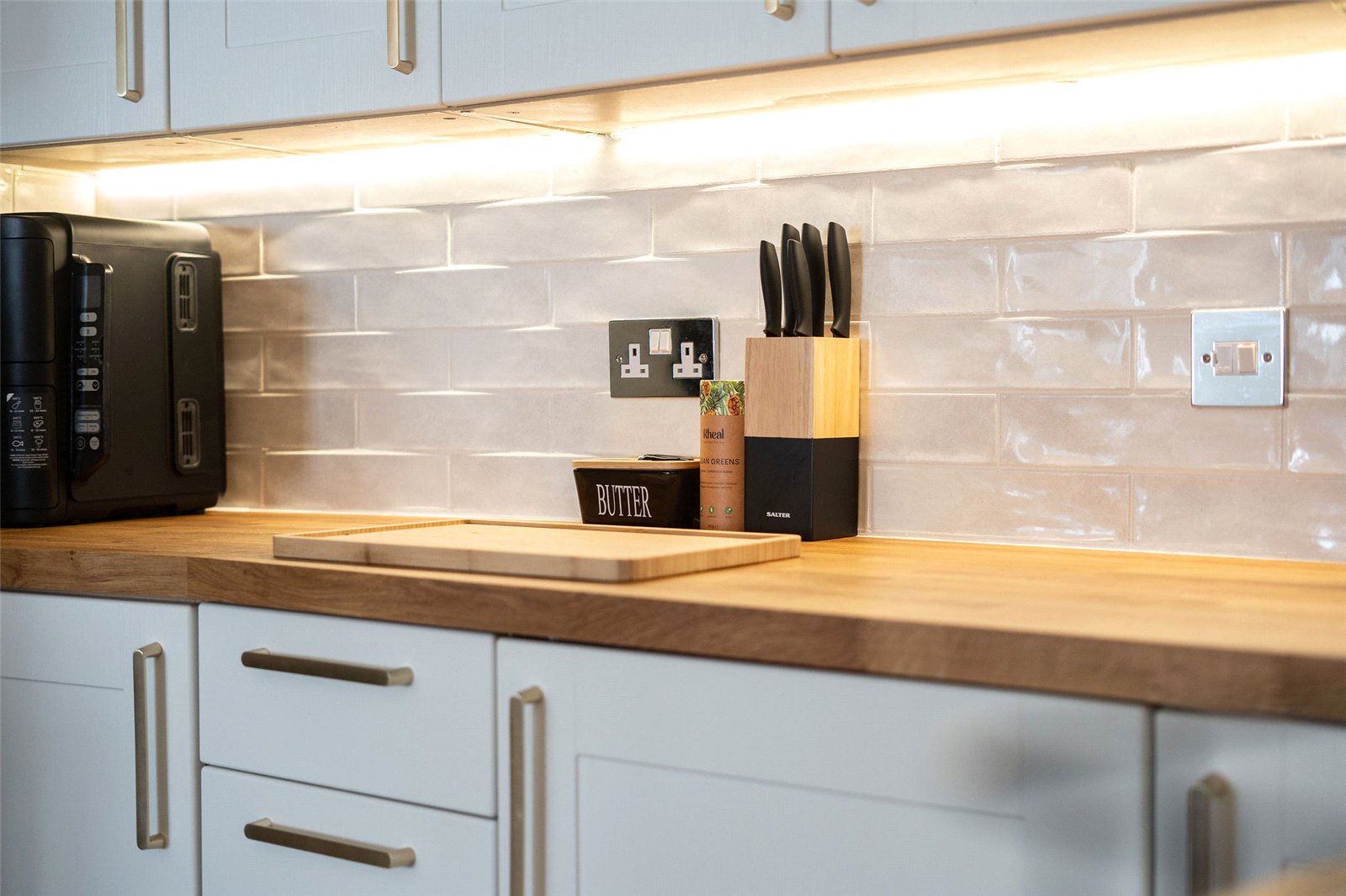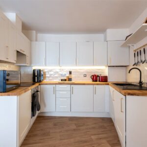 The accommodation flows naturally from the entrance hall into the heart of the home—a spacious open-plan sitting room and kitchen/dining area. The kitchen is fitted with a quality white shaker-style range, integrated appliances, and ample space for both dining and relaxing. Two generously proportioned double bedrooms are well positioned to the rear, each benefiting from pleasant views and natural light. A modern bathroom completes the accommodation, featuring a bath with shower and stylish fittings.