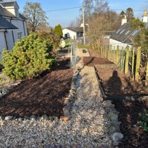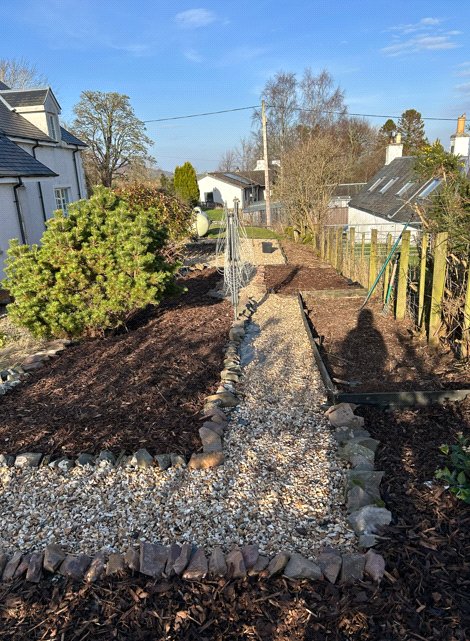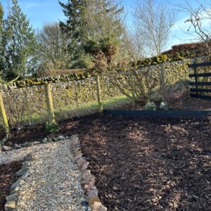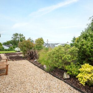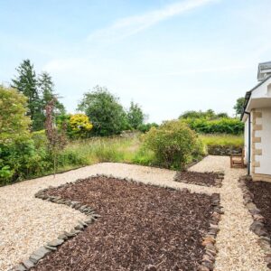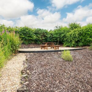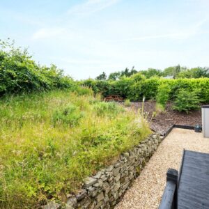 Outside the garden has a mix of wildflowers and meadow grass with a stone path around the property, a secluded raised seating area and lawn to the side.